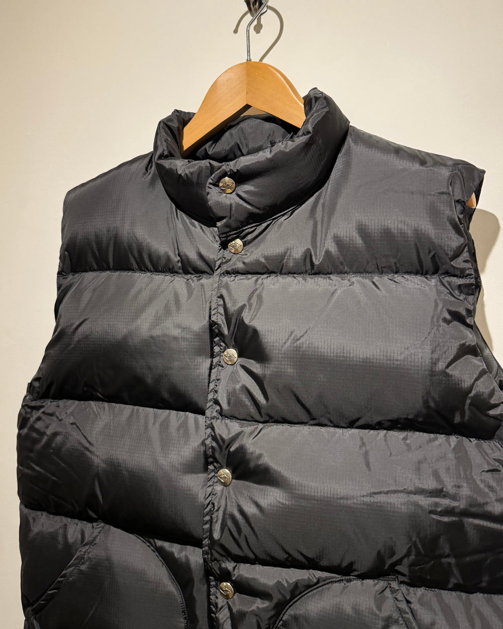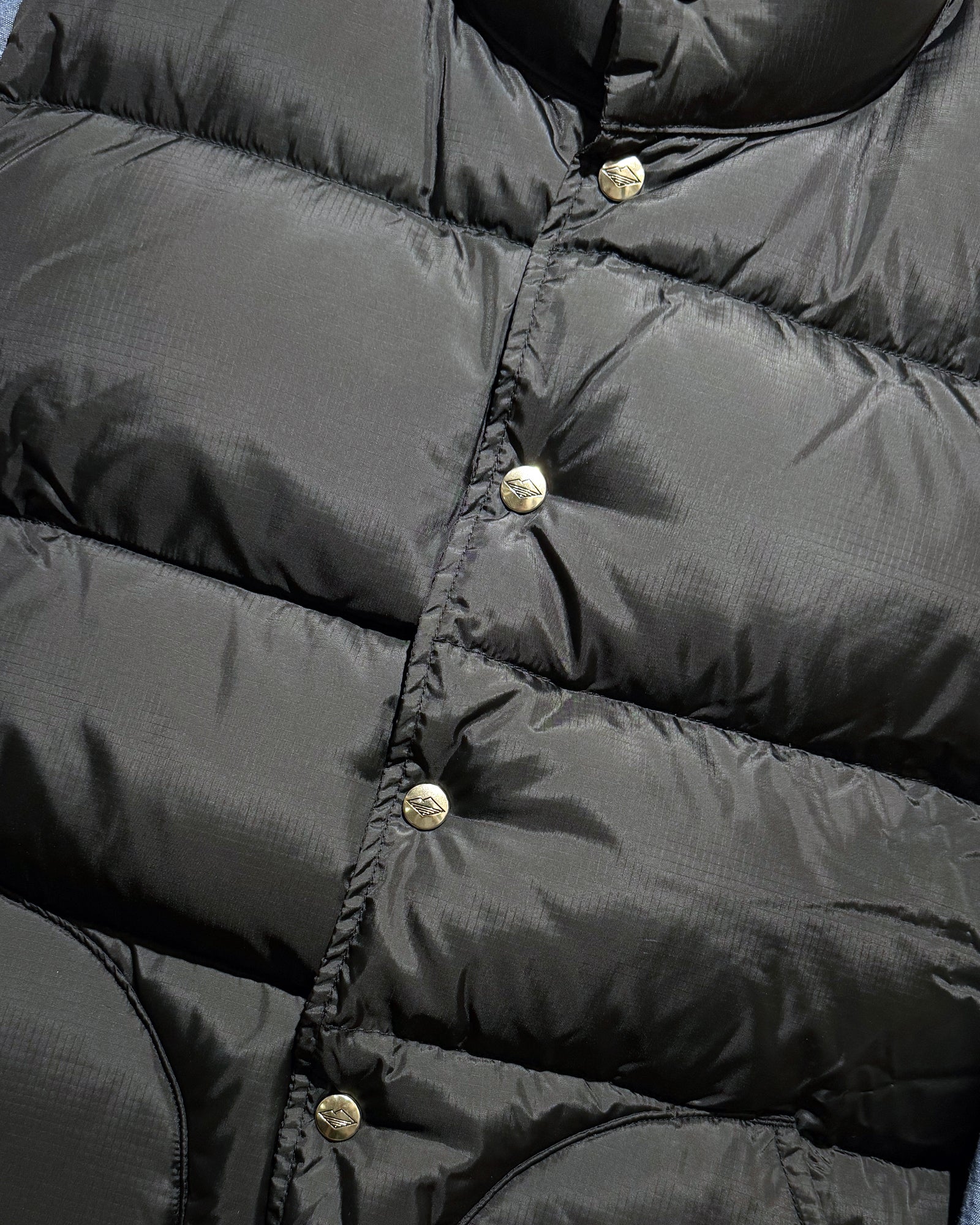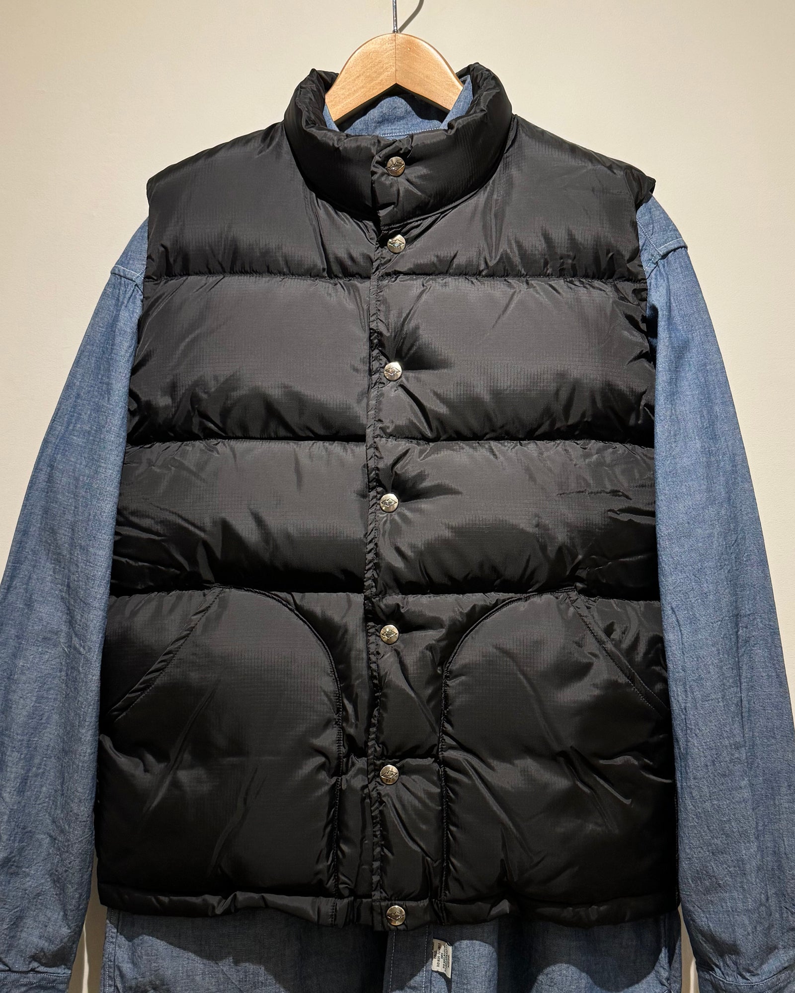 バテンダウンベストのファーストバージョンも名作ですが、V.2はさらにレベルアップしています。ブランドロゴの刻印をあしらったシルバーのボタンも特徴的です。