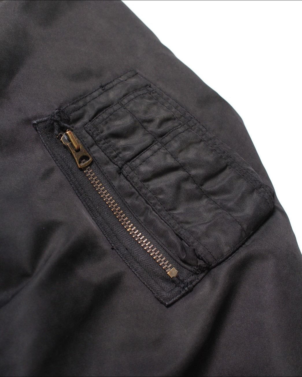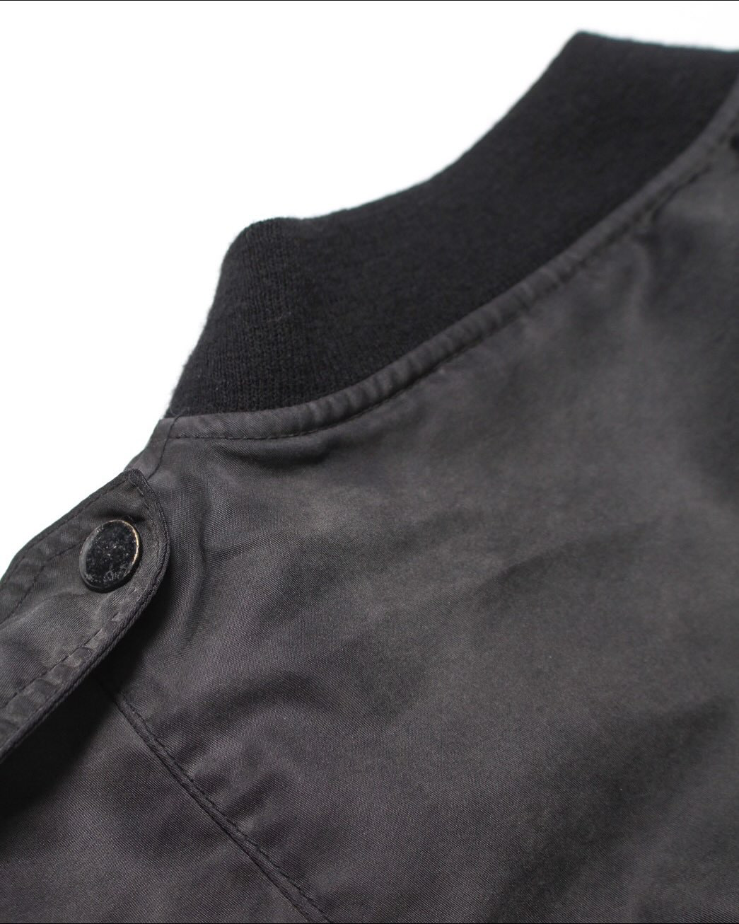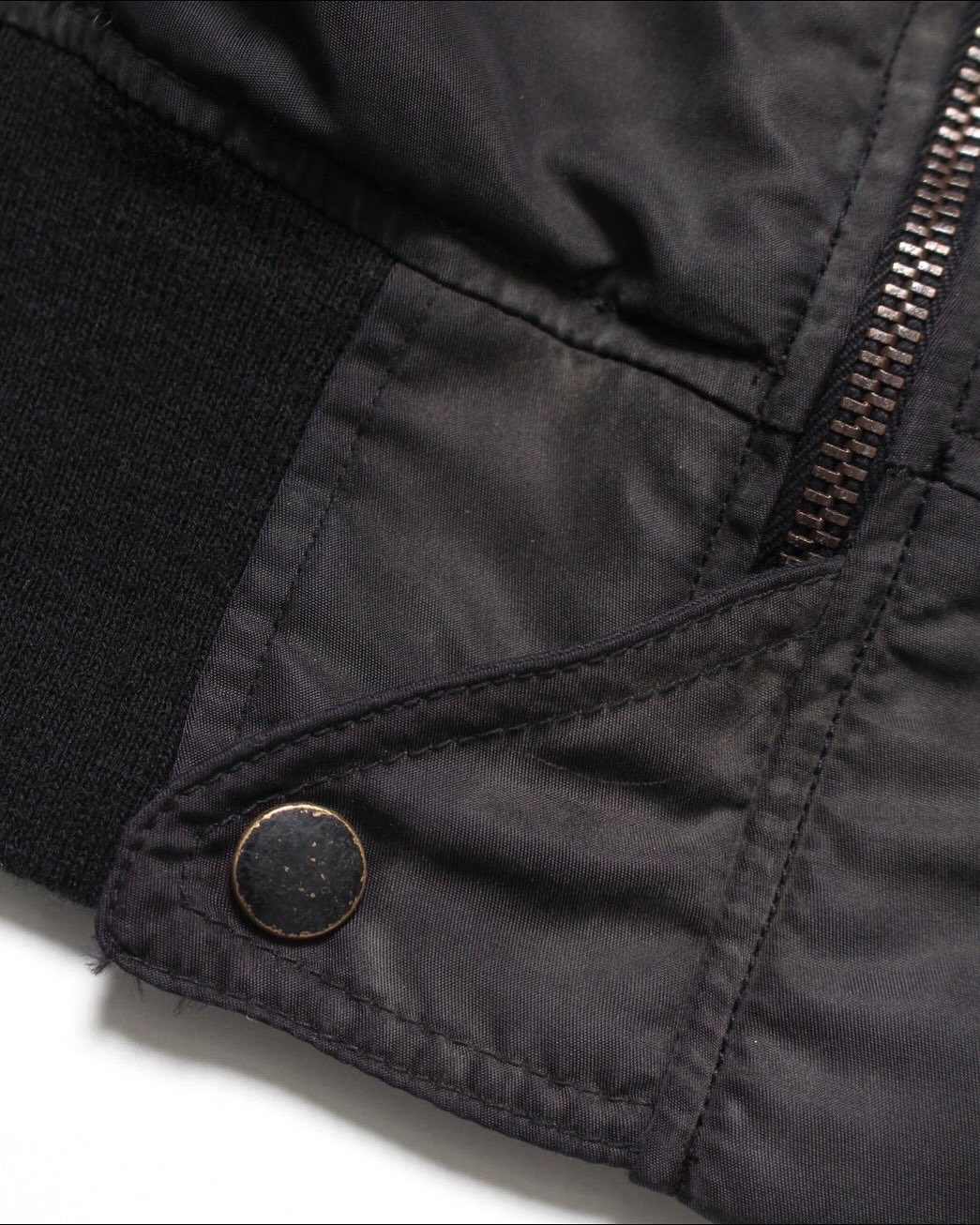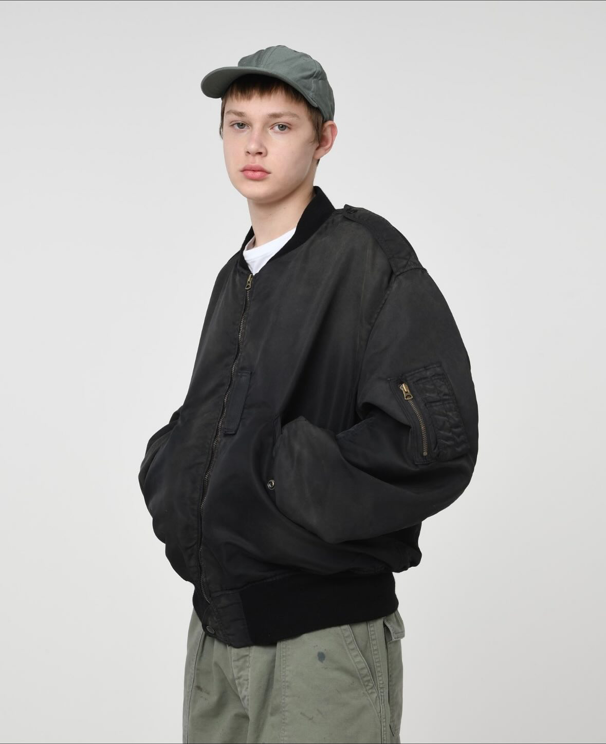 1950年代から1960年代にかけて活躍した、U.S. Air Forceのライトゾーン用フライトジャケットを代表する L-2B FLIGHT JACKET。中綿を持たない構造は現代のストリートにも最適。本作のライニングは、初期型仕様を再現し、レスキューオレンジではなく都市型仕様のブラック。見たこともないほど着古されたフライトジャケットを作り込むため、ファスナーの歪みにまでこだわり、リメイク工程を取り入れた渾身の一枚。[Text by BOW WOW]