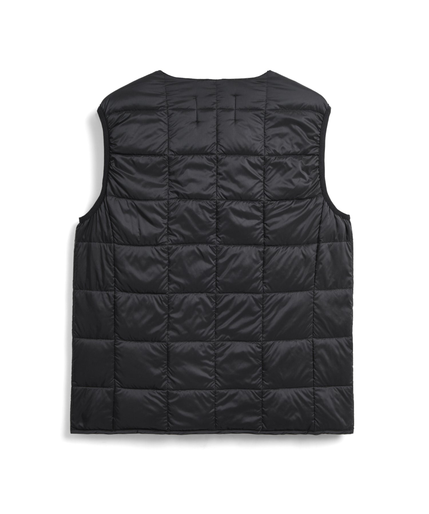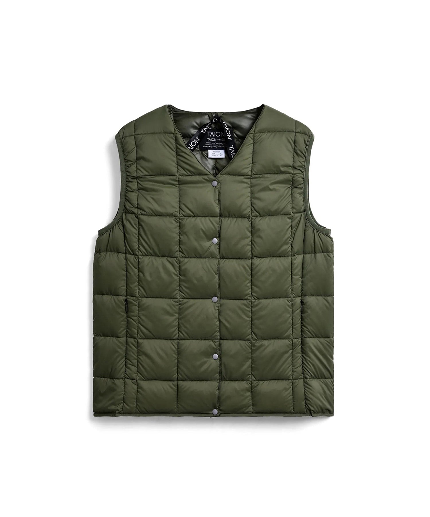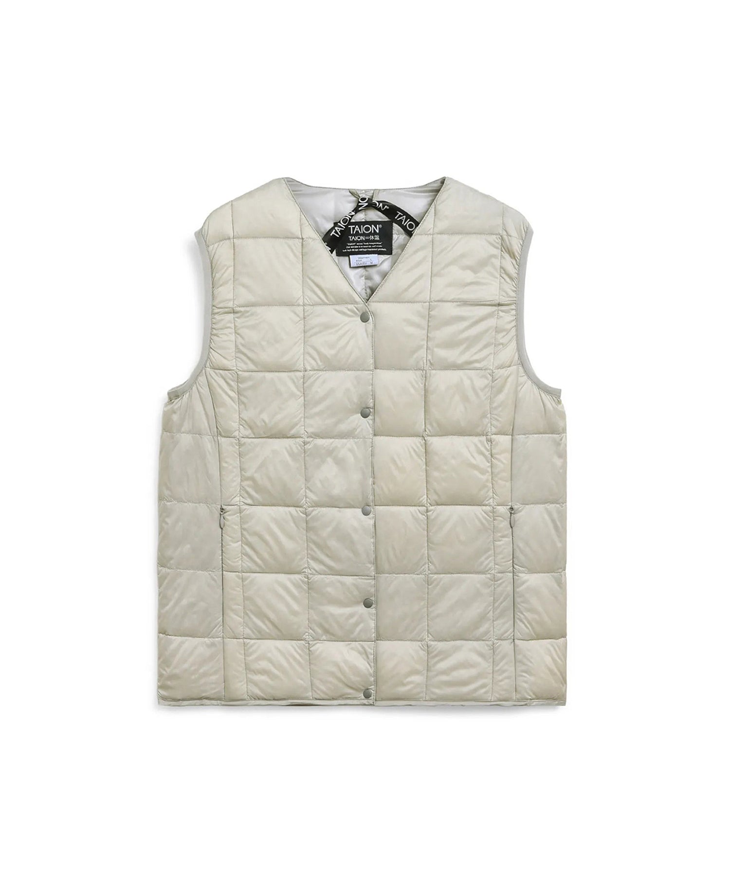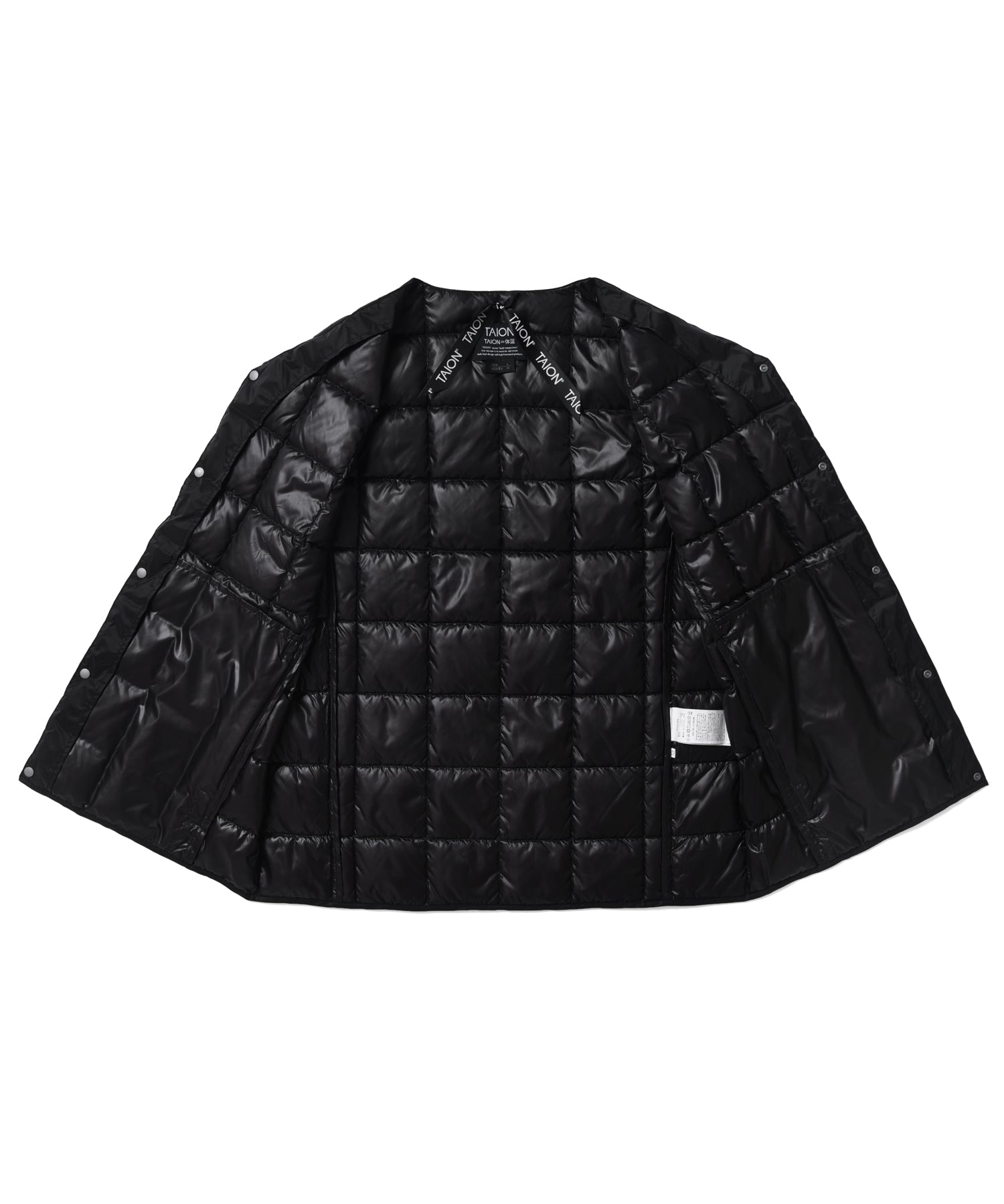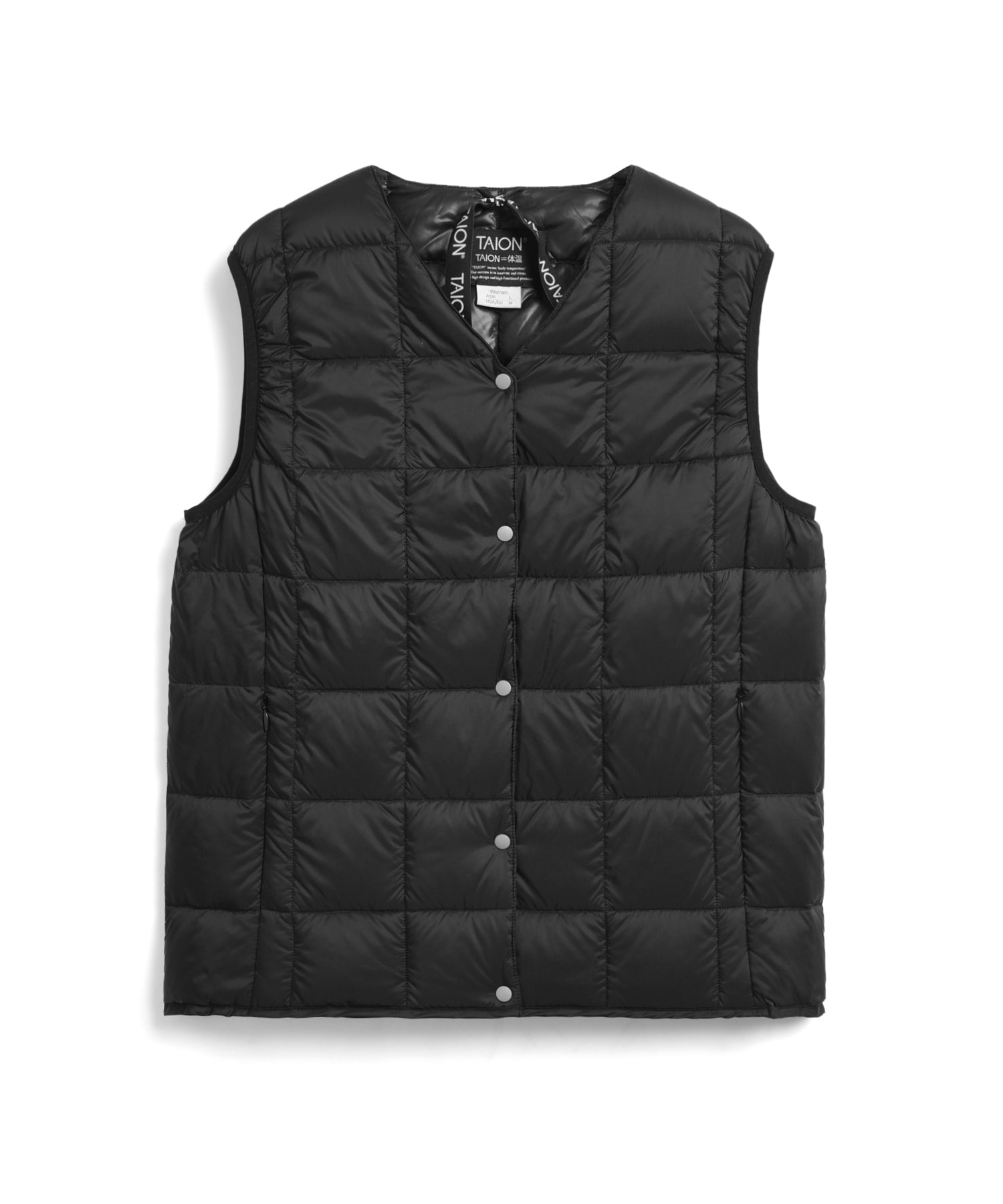 〈TAION〉の定番、ベーシックインナーダウンは、ジャケットやコートの下に着るのはもちろん、Tシャツ・シャツ・パーカーなどの上にも気軽に羽織れる、軽くて暖かく着回しやすいシンプルなデザインが特徴です。