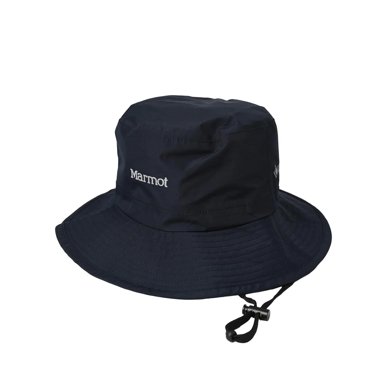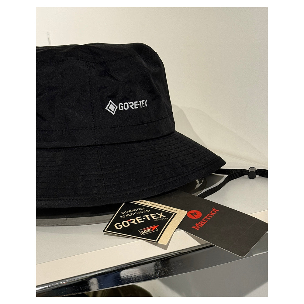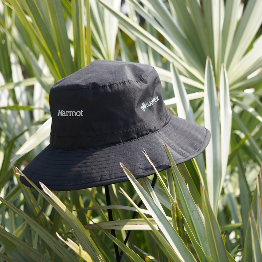 バックベルトでサイズを調整可能。Marmotロゴは防水性を損なわないよう反射プリントで表現。吸水速乾機能を持った汗帯テープ付き。