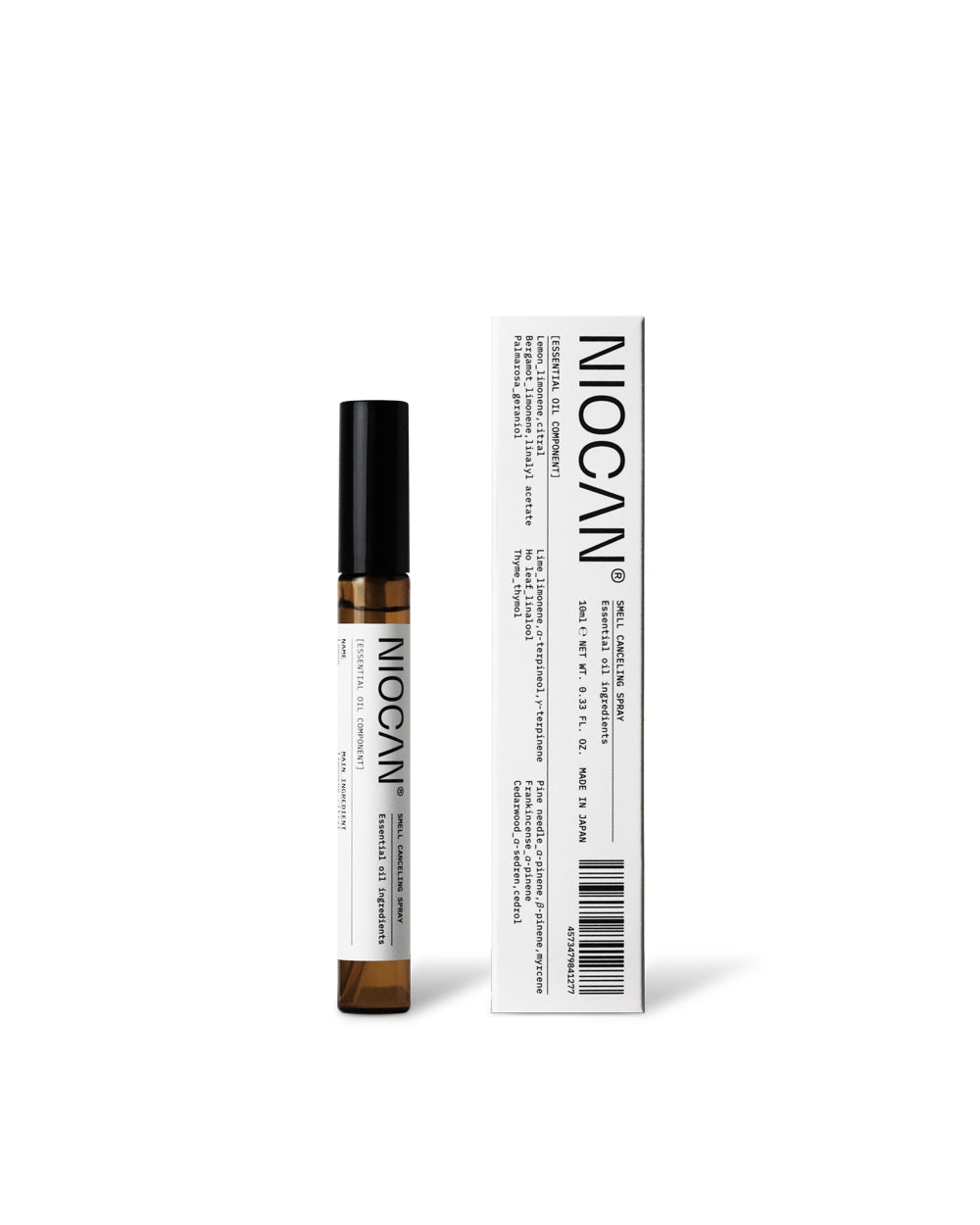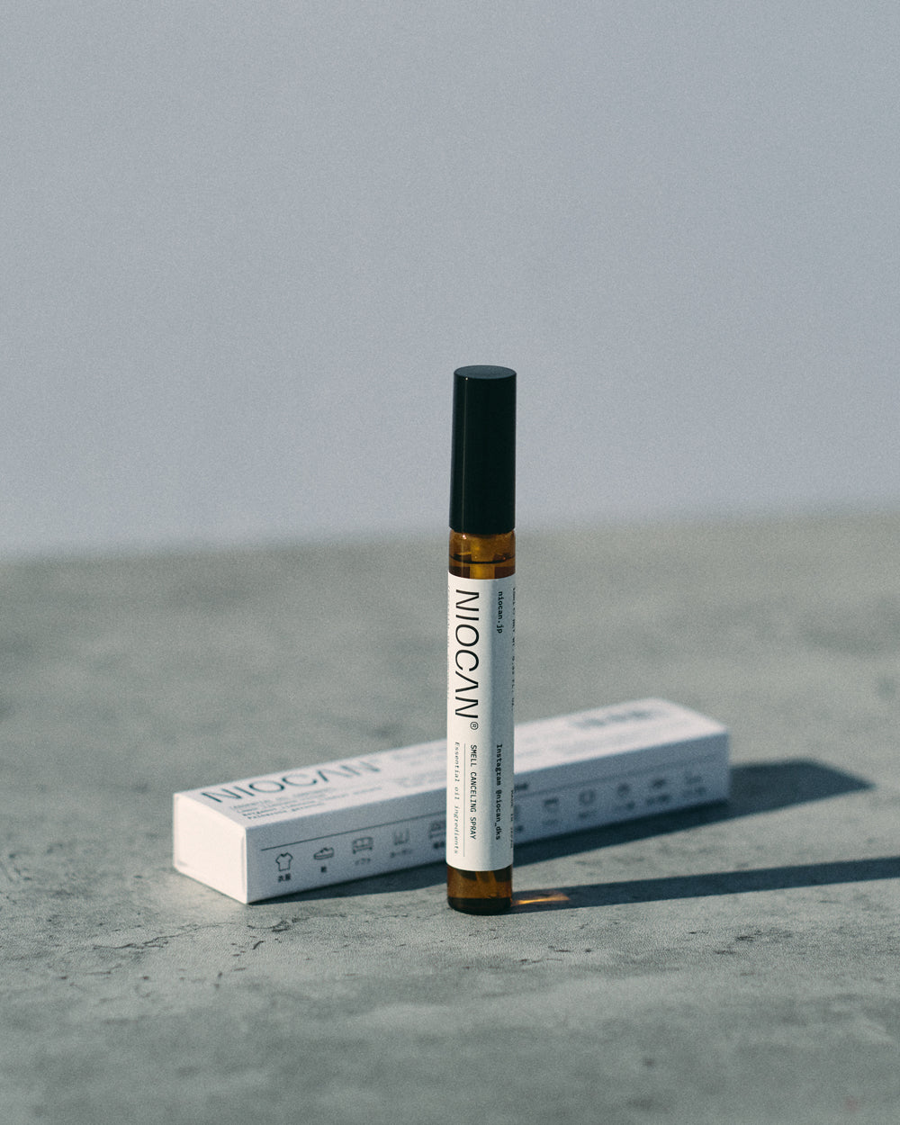 レモン、ベルガモット、フランキンセンス、ホーリーフなど9種の天然精油を独自に配合した消臭・除菌スプレー〈ニオキャン〉。