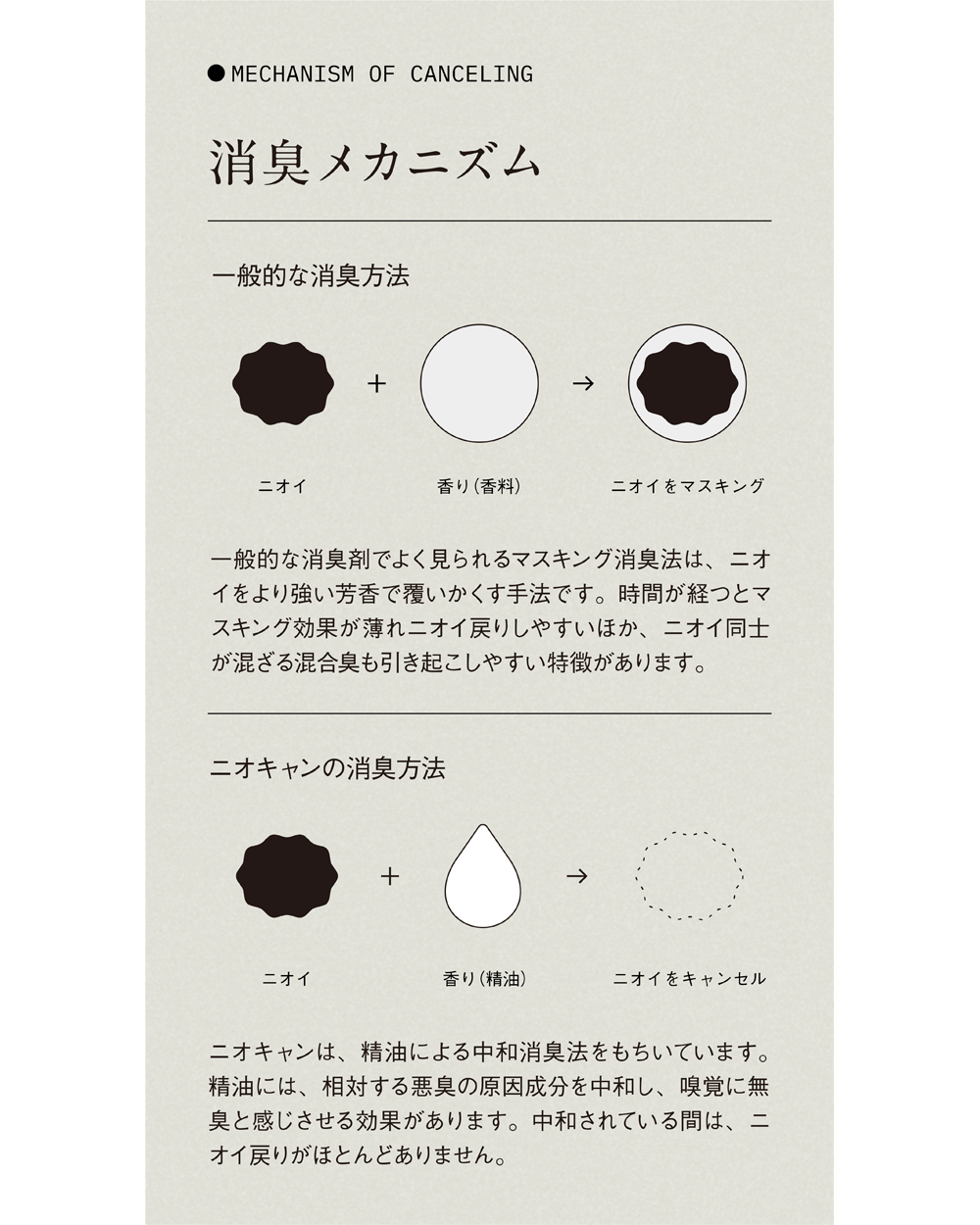 ニオキャンは、多様な生活臭に合わせて天然精油を独自に配合。