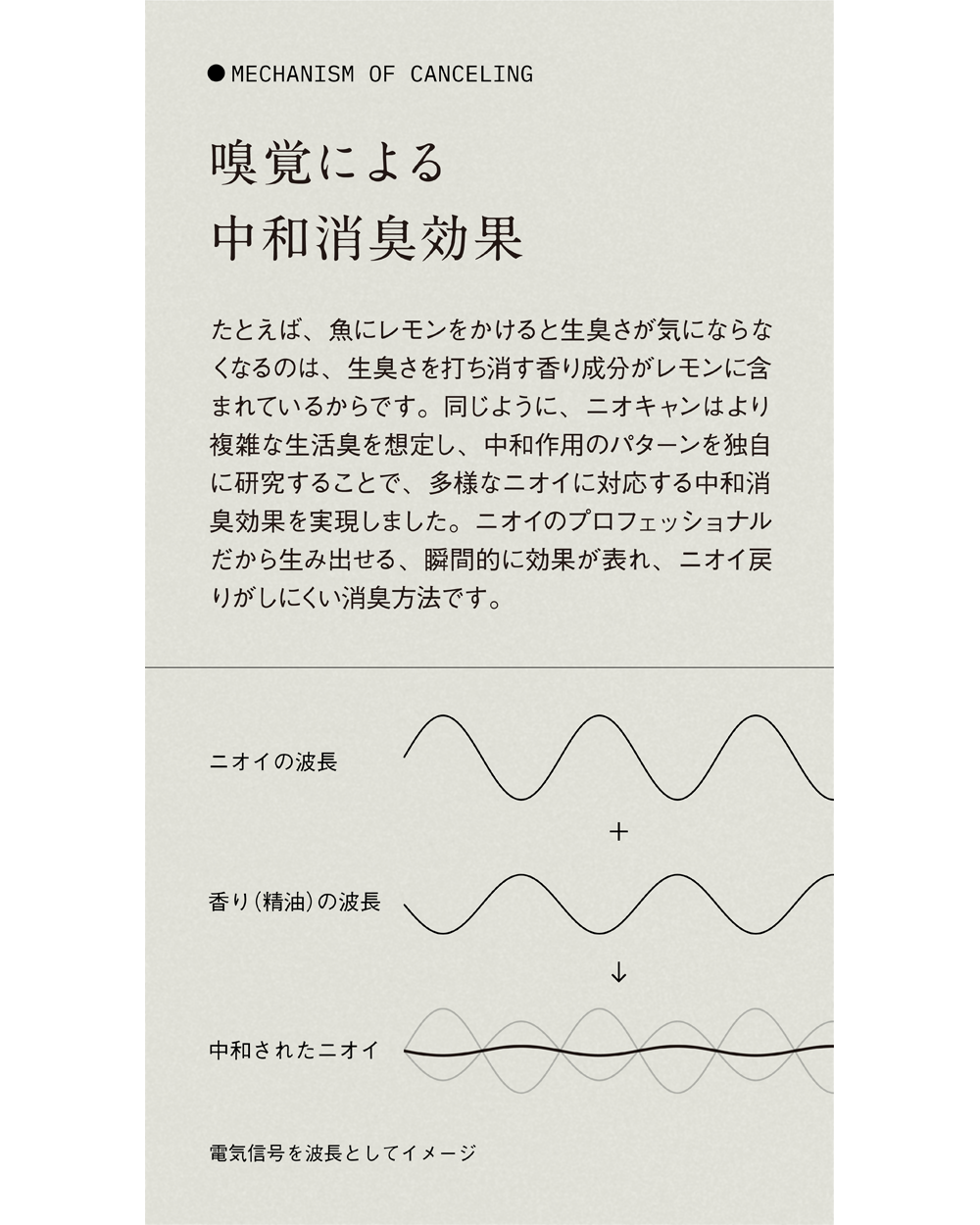 気になるニオイを香りでごまかす(マスキング)のではなく、天然精油が持つ成分で打ち消して無臭化するニオキャンの「中和消臭技術」。それを実現しているのが、ニオイのプロフェッショナルである臭気判定士の技術です。複雑に混ざり合う生活臭の成分にあわせて、いくつもの精油を緻密なバランスで組み合わせ、ニオイに対する不快感を和らげます。