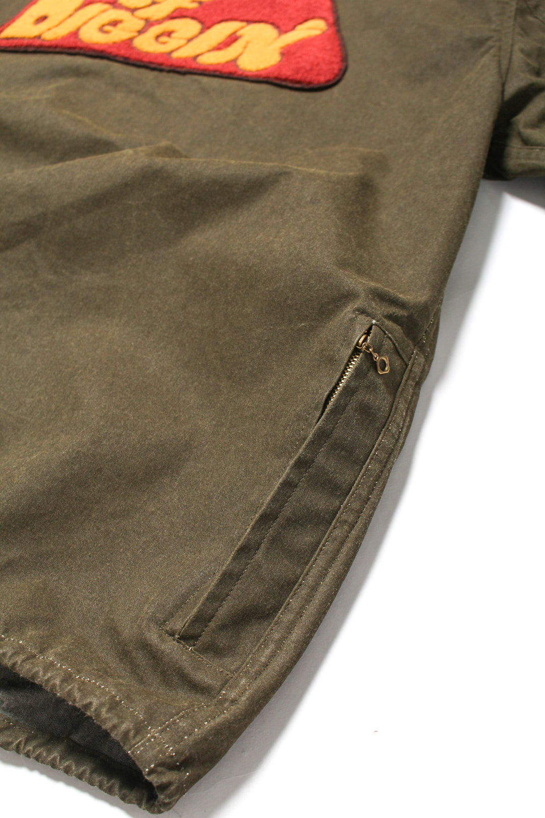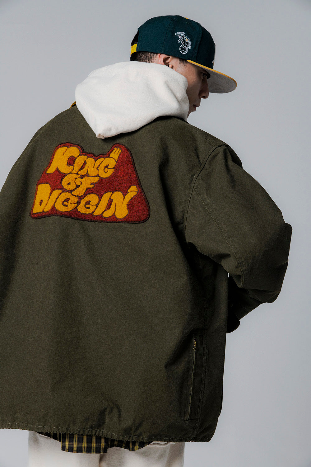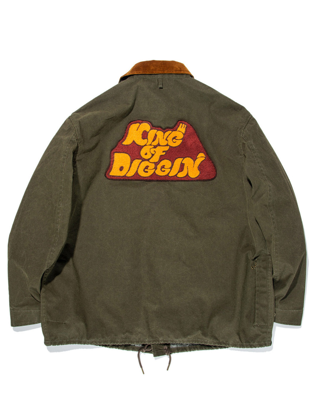 バックのKING OF DIGGIN’モチーフのワッペンや、複数のポケットを配したデザインも印象的で、背面右裾や裏側にも小物の収納に適したジップポケットが付くなど、便利な機能性を備えているのもポイントです。