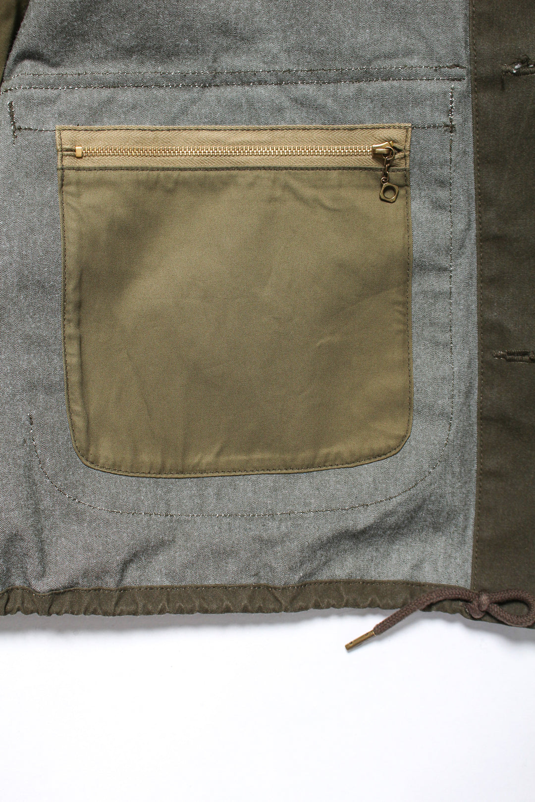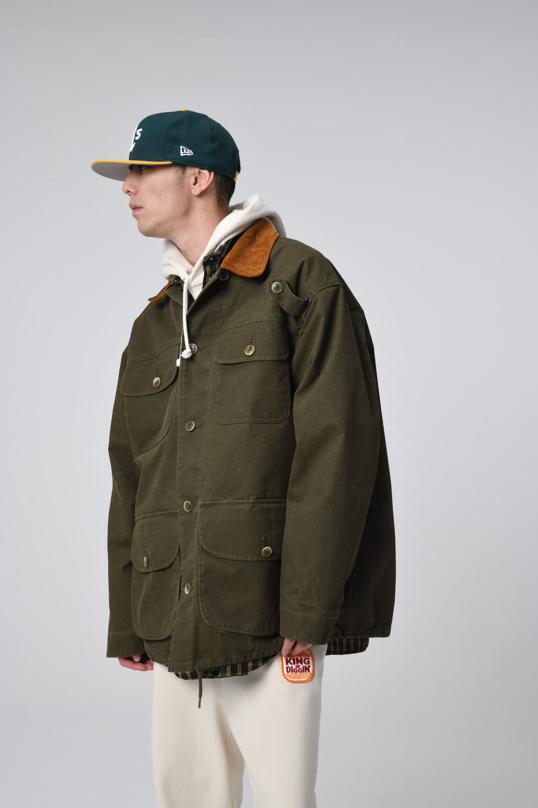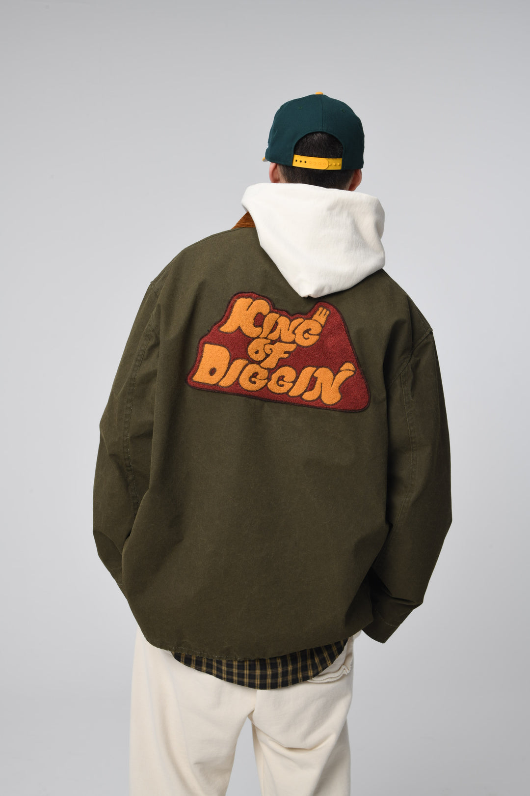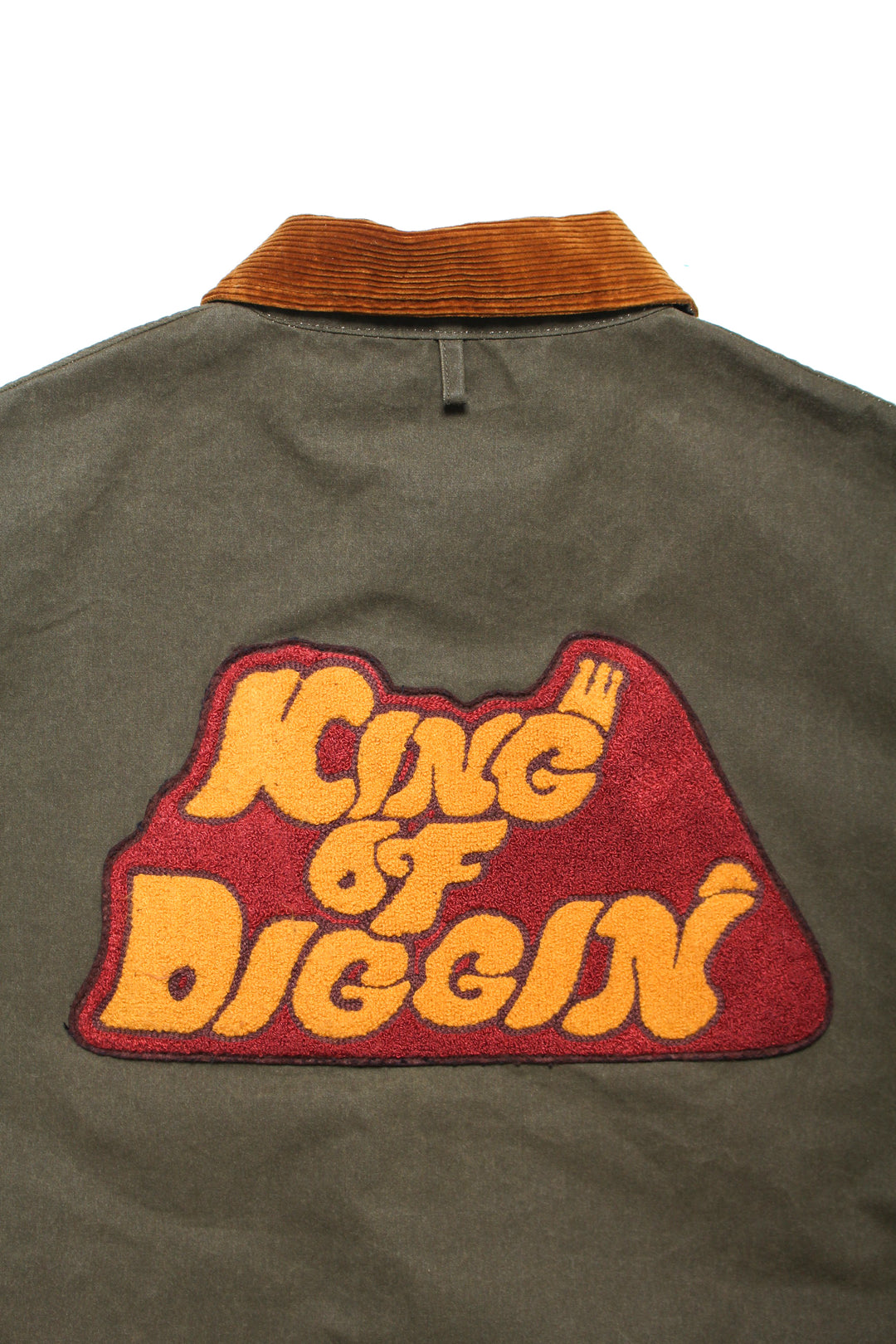 バックのKING OF DIGGIN’モチーフのワッペンや、複数のポケットを配したデザインも印象的で、背面右裾や裏側にも小物の収納に適したジップポケットが付くなど、便利な機能性を備えているのもポイントです。