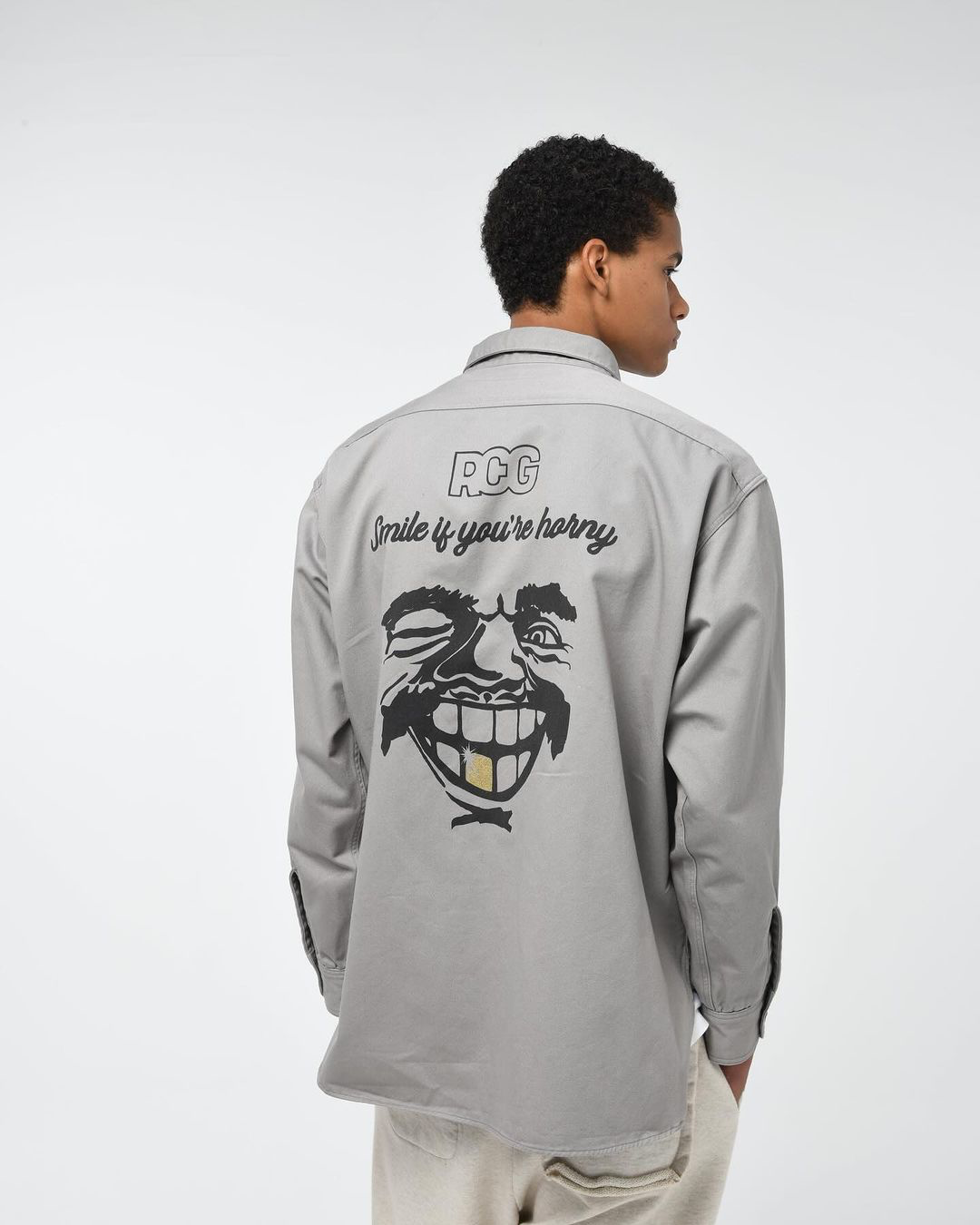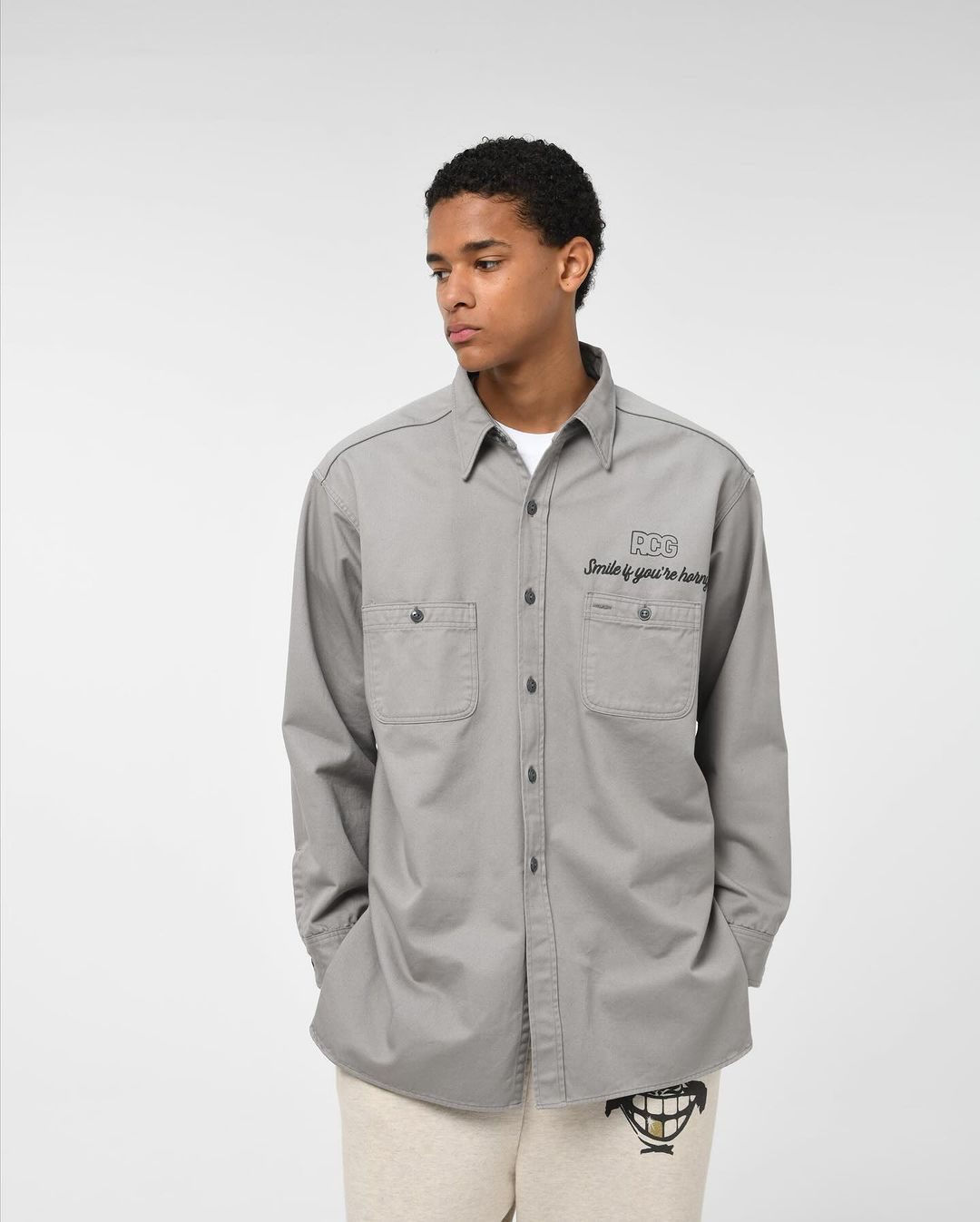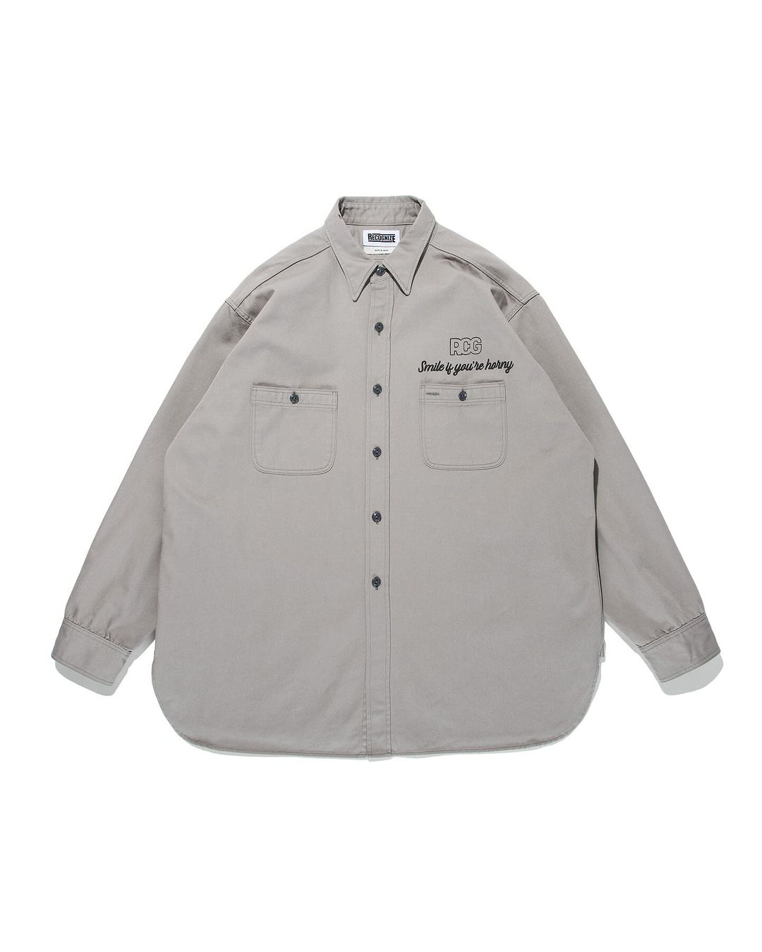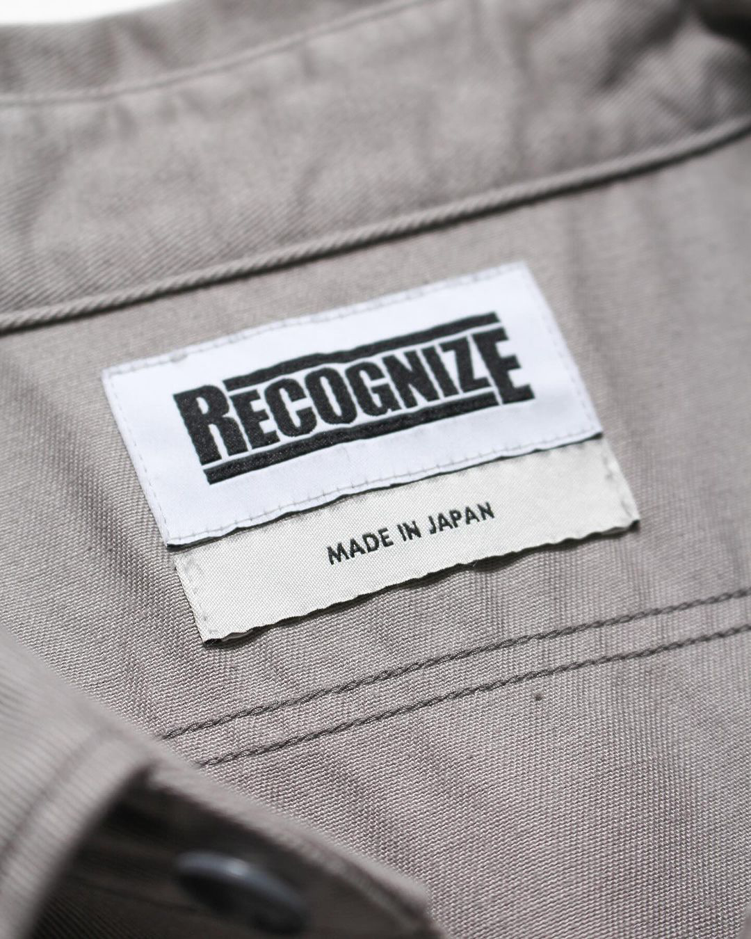 〈RECOGNIZE〉2024年秋冬コレクションより、今季のニューグラフィックを胸のポケットの上と背面に配したワークシャツです。