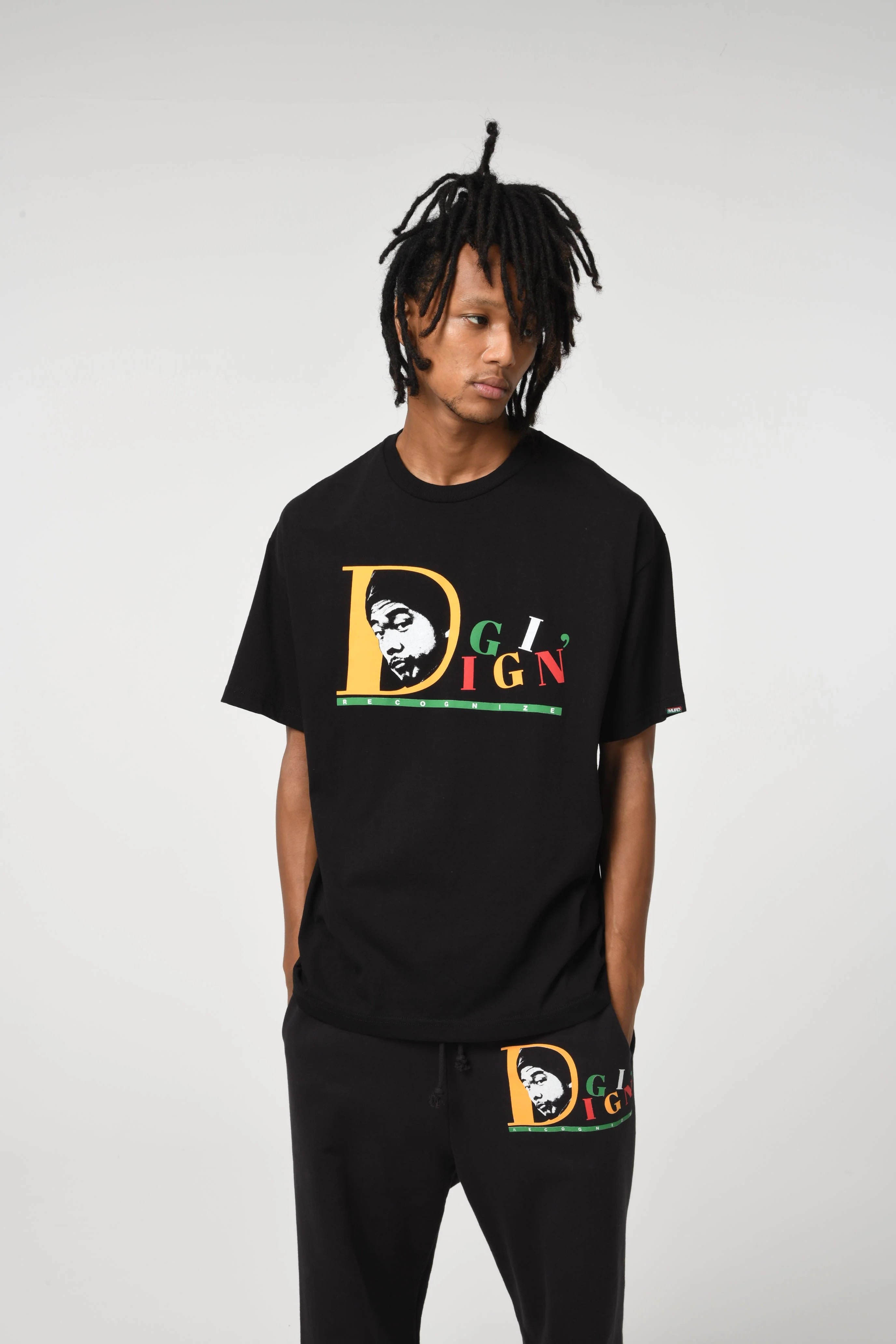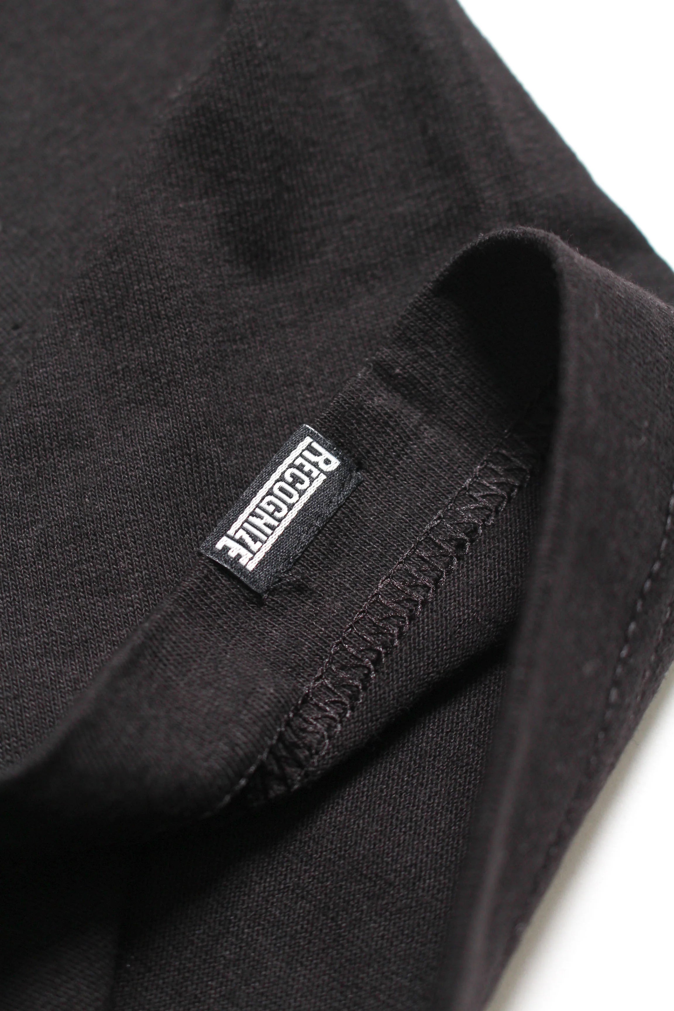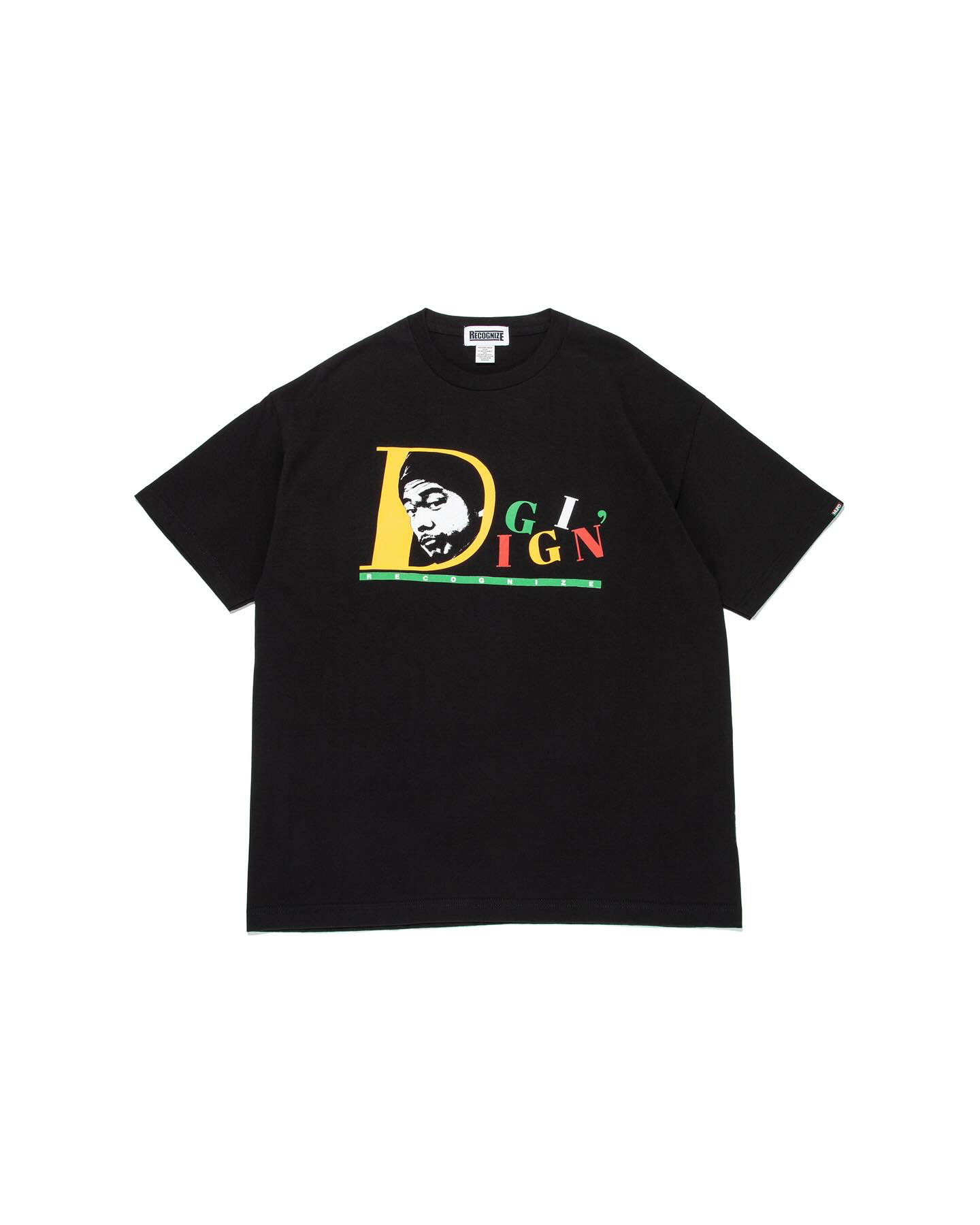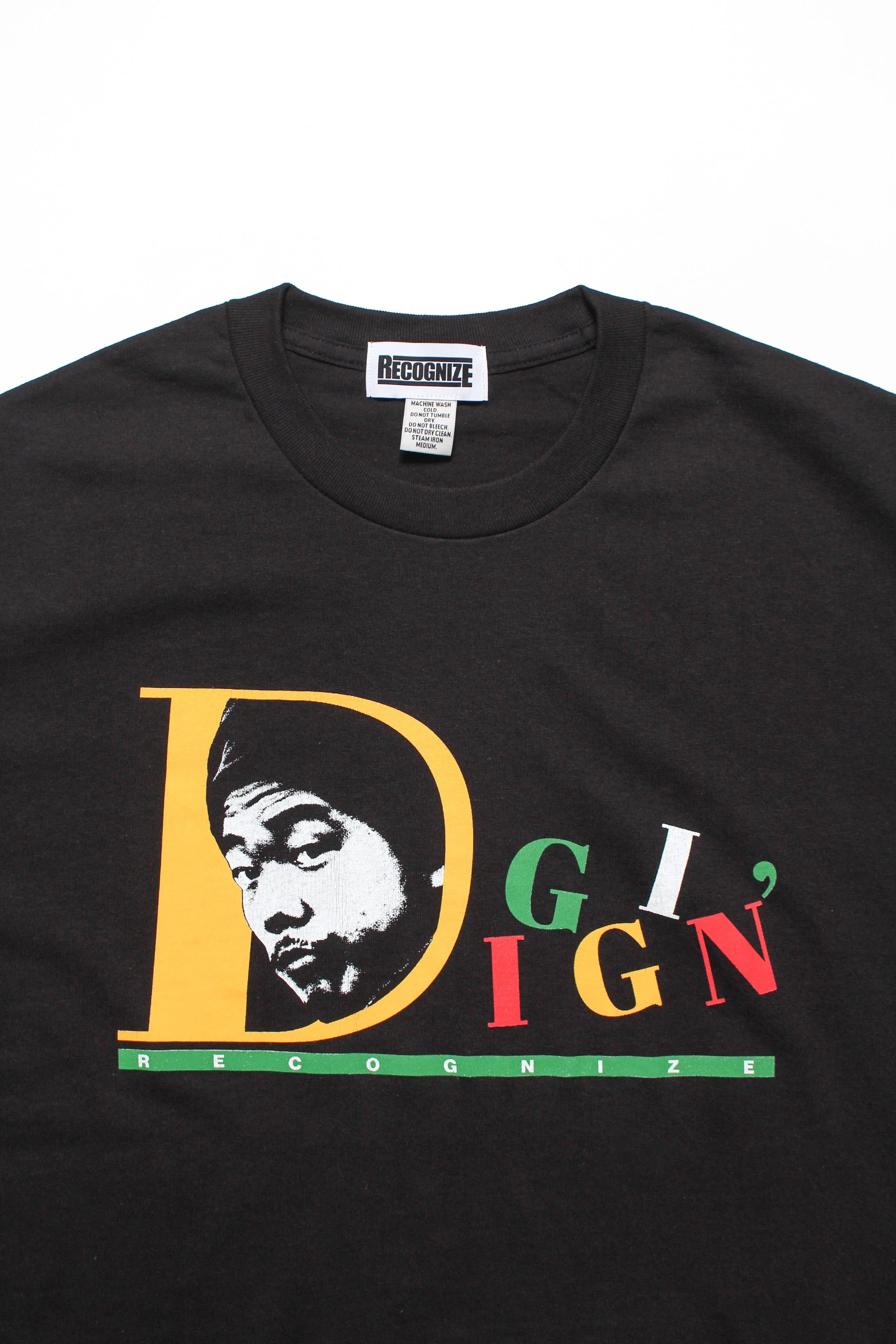 〈RECOGNIZE〉2025年春夏コレクションより、KING OF DIGGIN’ことMUROの90年代のアーティスト写真をモチーフにしたグラフィックが印象的な1枚です。RAP TEEのような雰囲気がスタイルを彩ります。