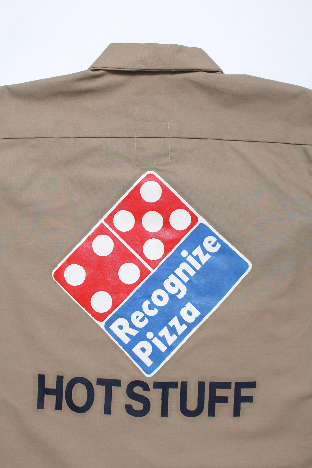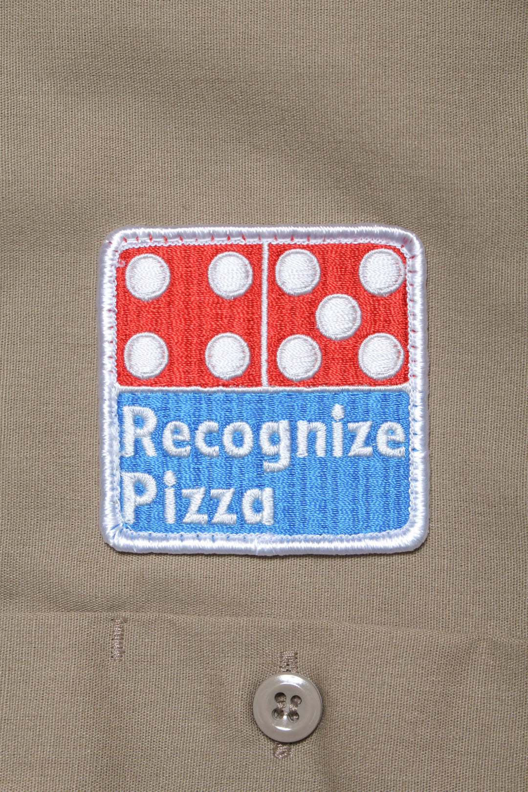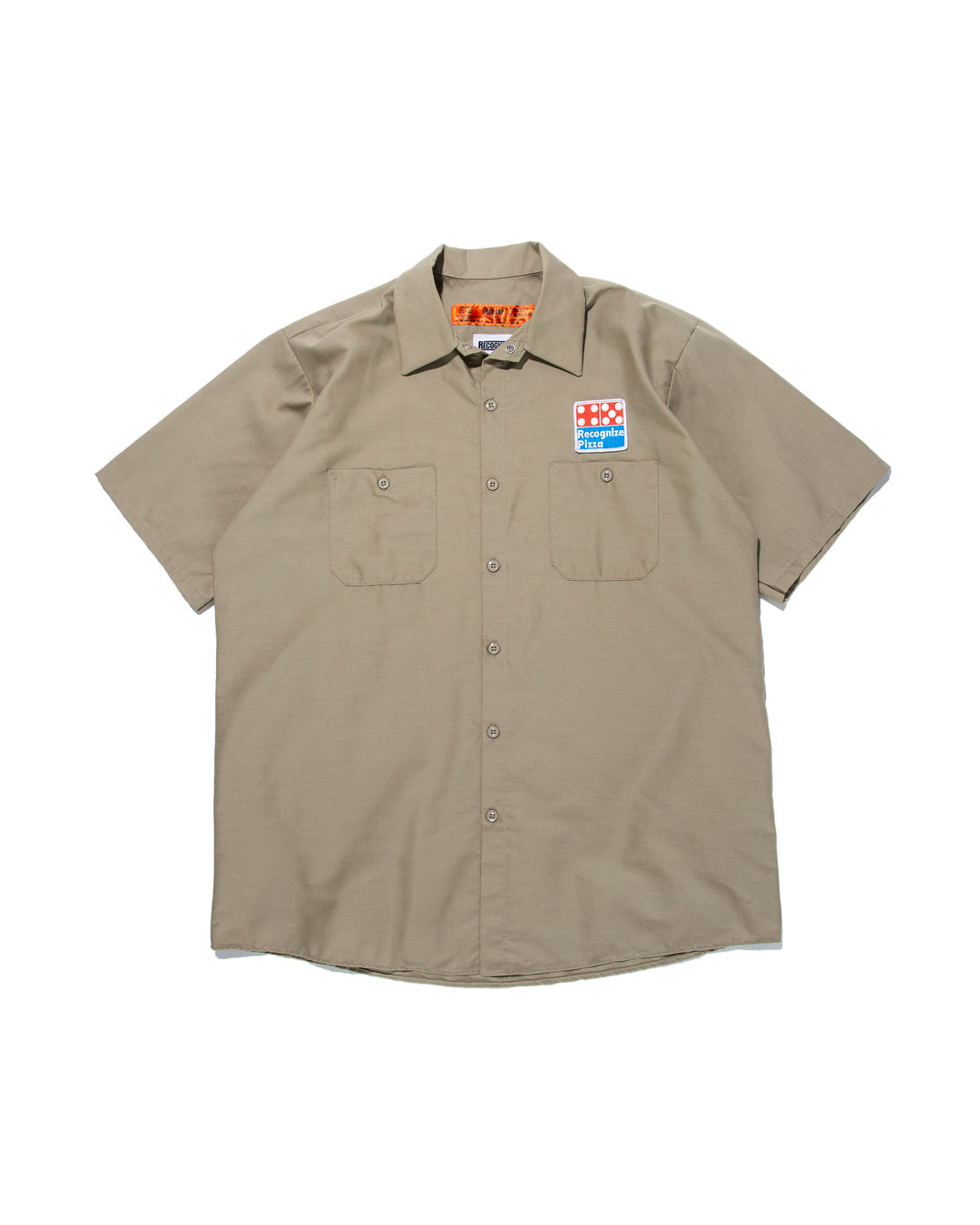 ピザショップのユニフォームをイメージして、新しいグラフィックをワッペンとプリントに落とし込み作製したショートスリーブワークシャツ。
