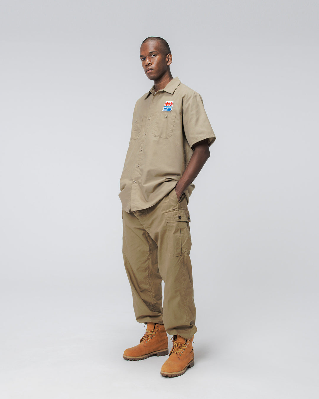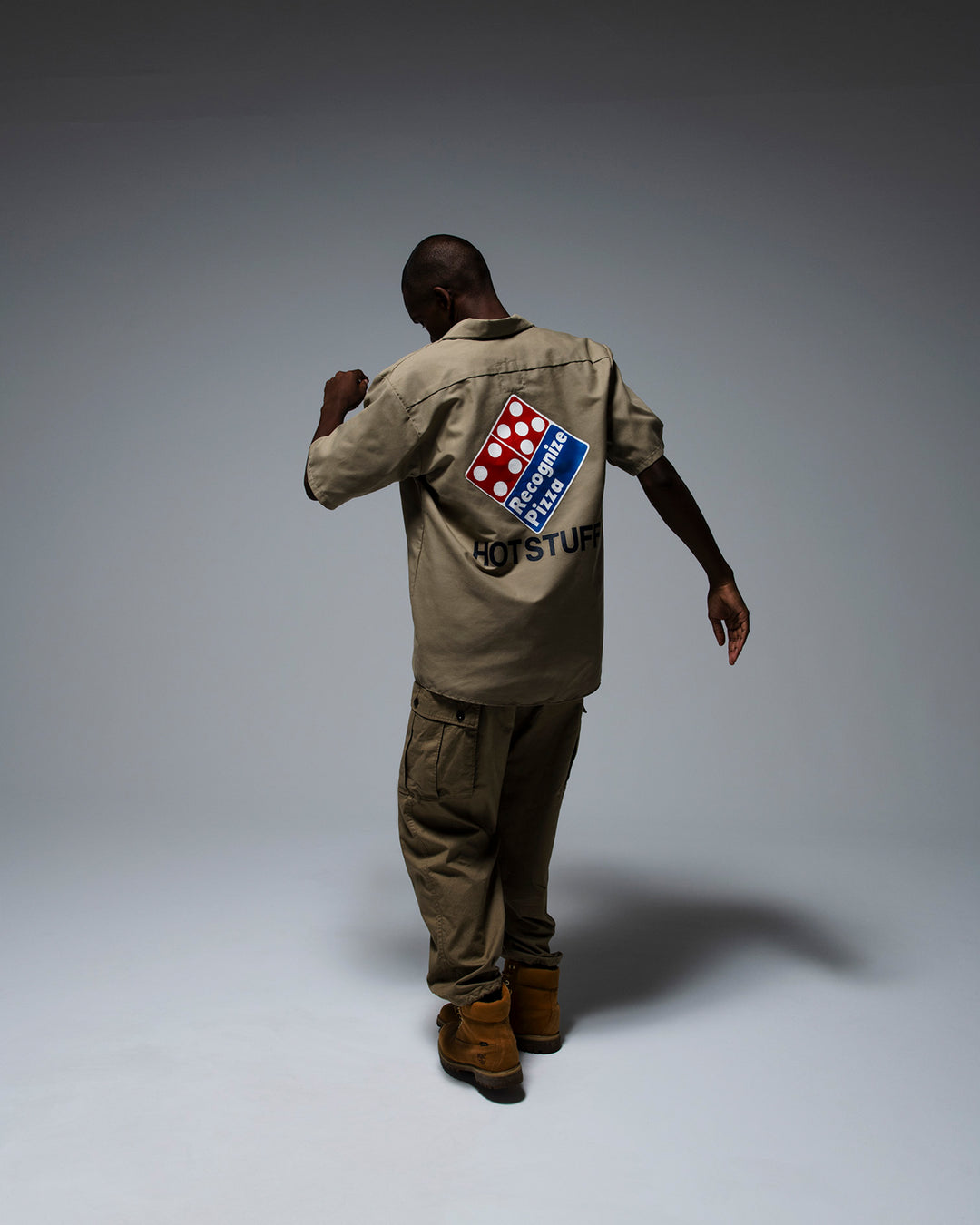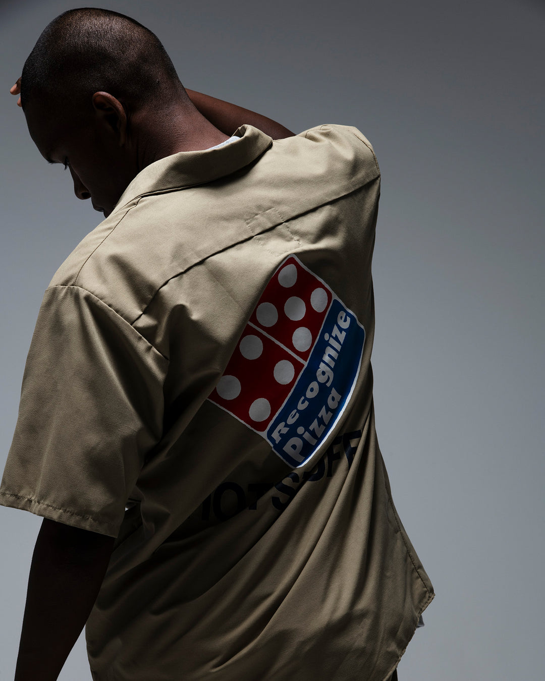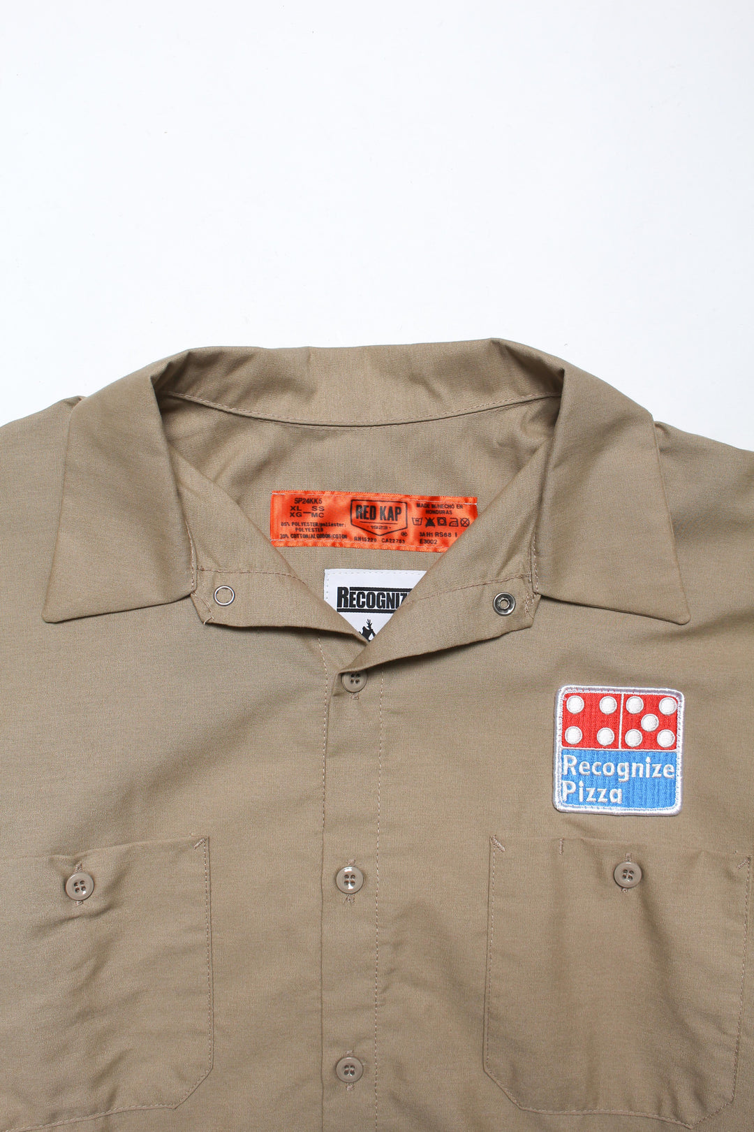 ピザショップのユニフォームをイメージして、新しいグラフィックをワッペンとプリントに落とし込み作製したショートスリーブワークシャツ。