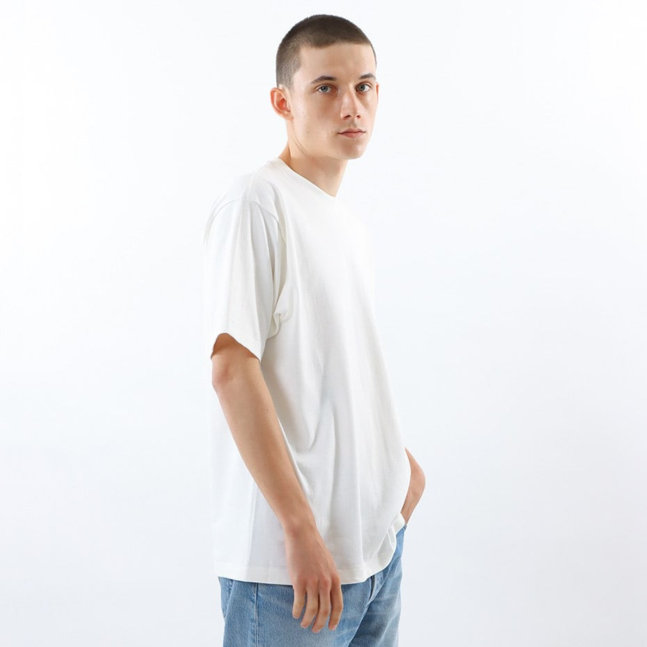 生地は3枚入りパックTシャツ赤ラベルで使用している糸を双糸にして編立てた、厚みと柔らかさを兼ね備えた7.0オンス。カラー展開は独自製法で生み出したこだわりの白の1色です。