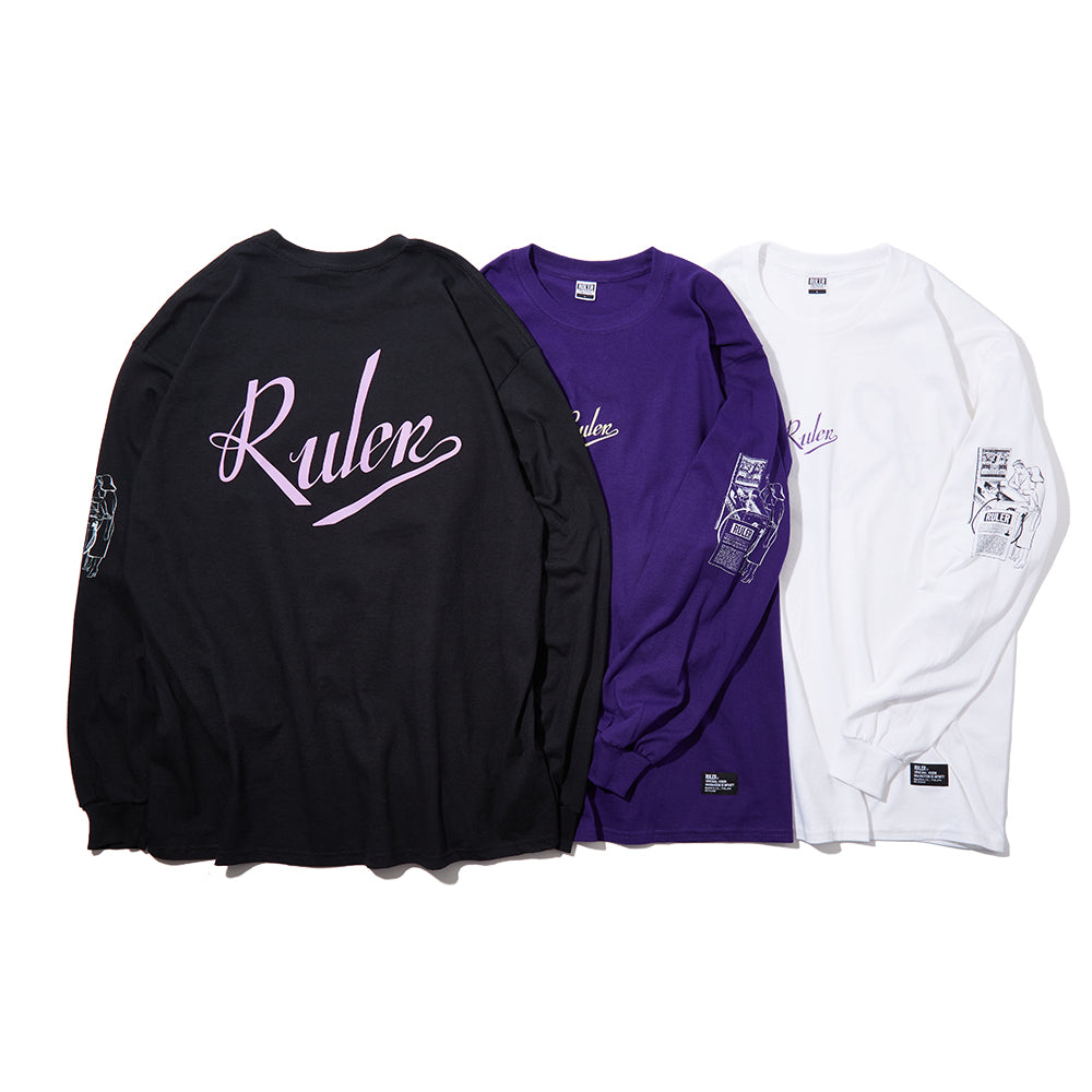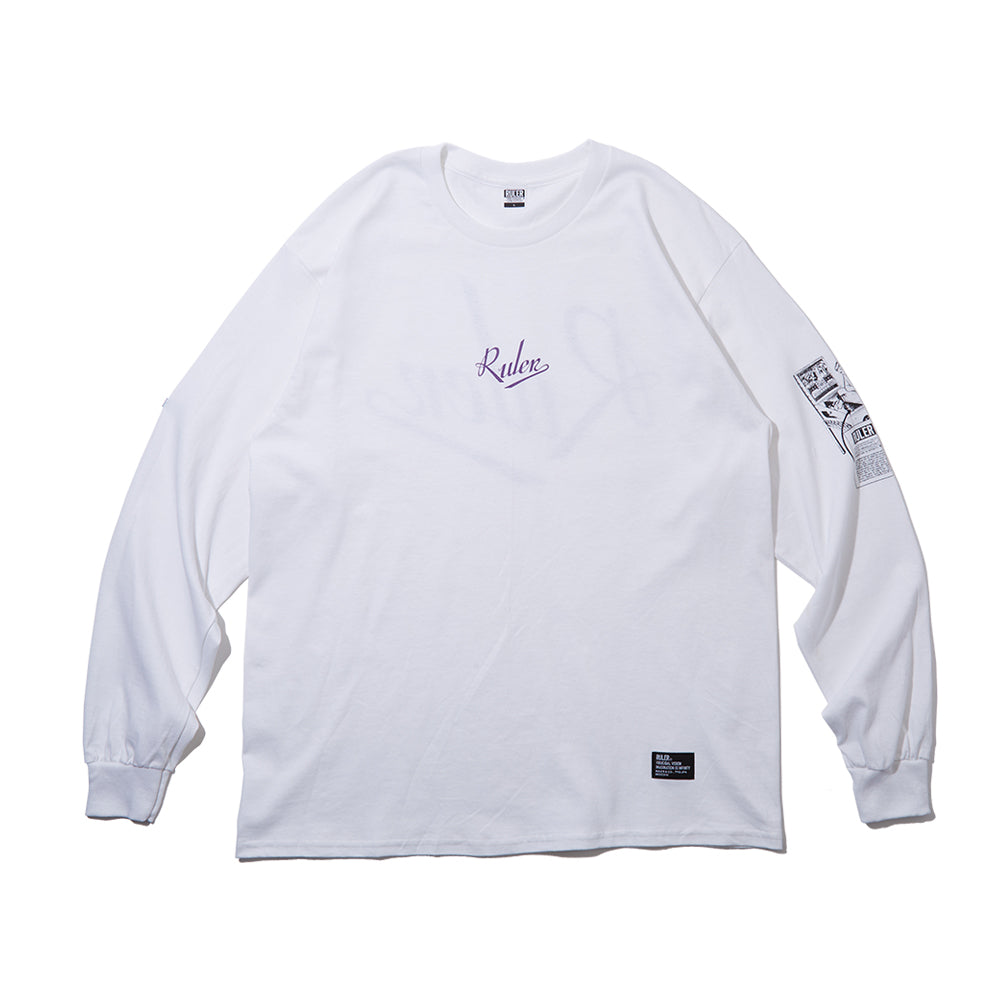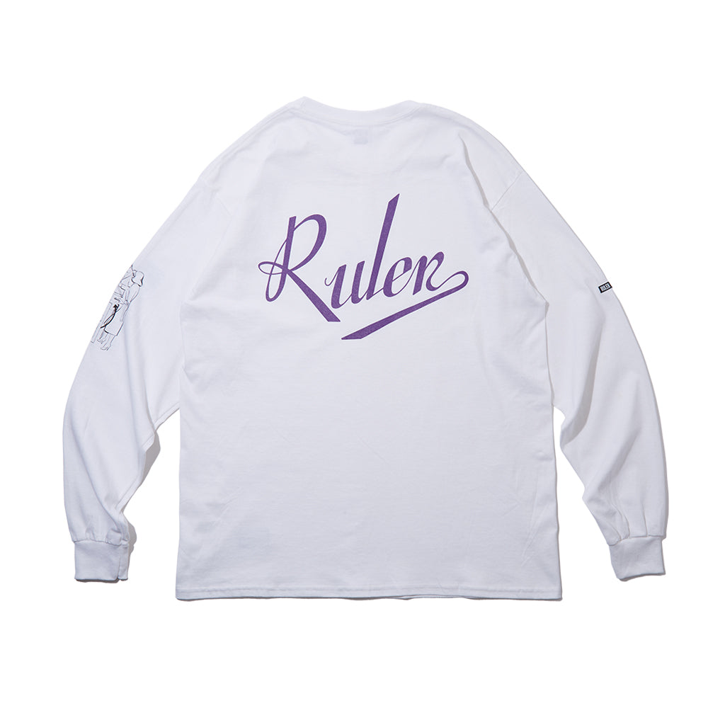 フロント、アーム、バックにシルクスクリーンプリントでアートワークを配した〈RULER®︎〉のロングスリーブTシャツ。
