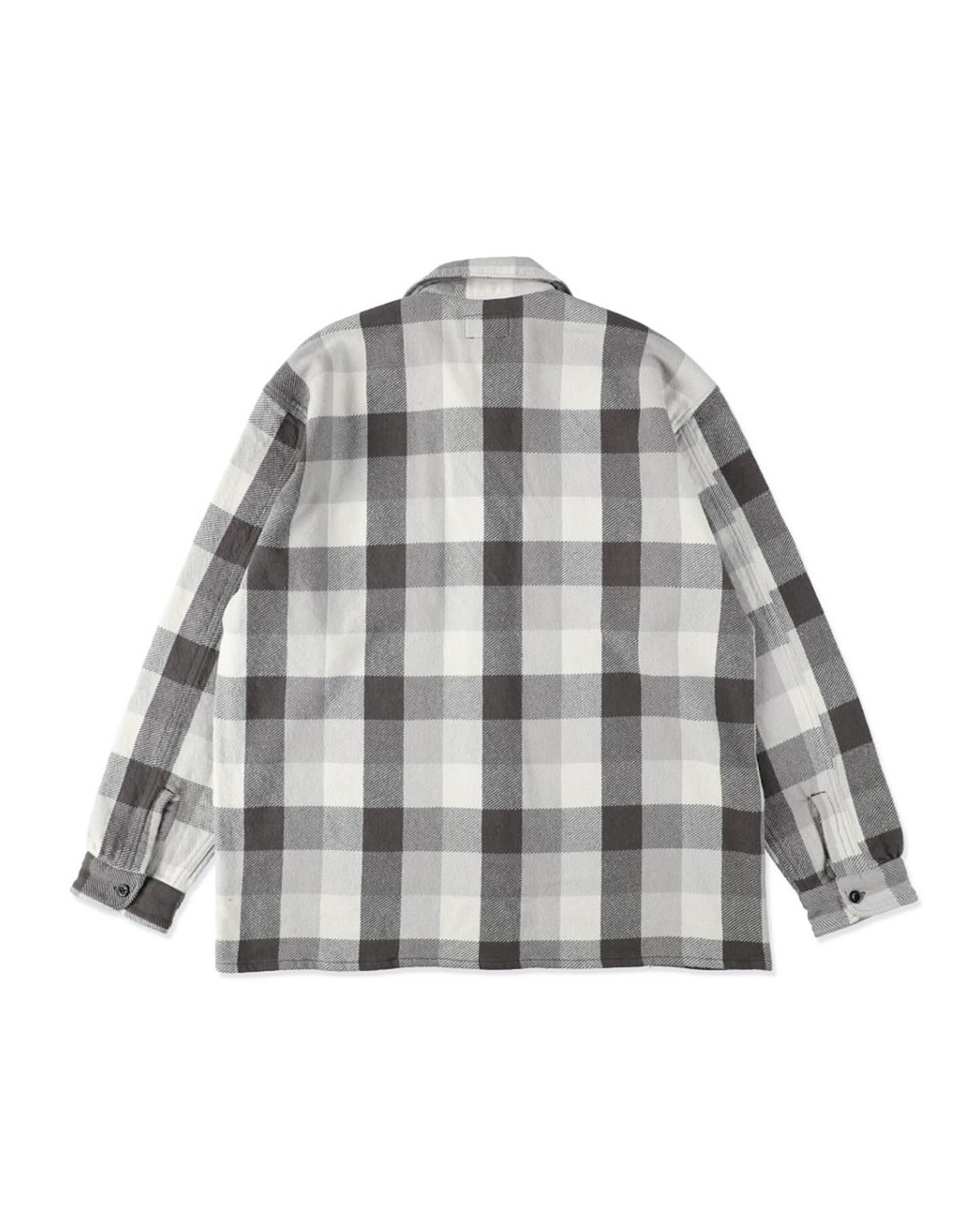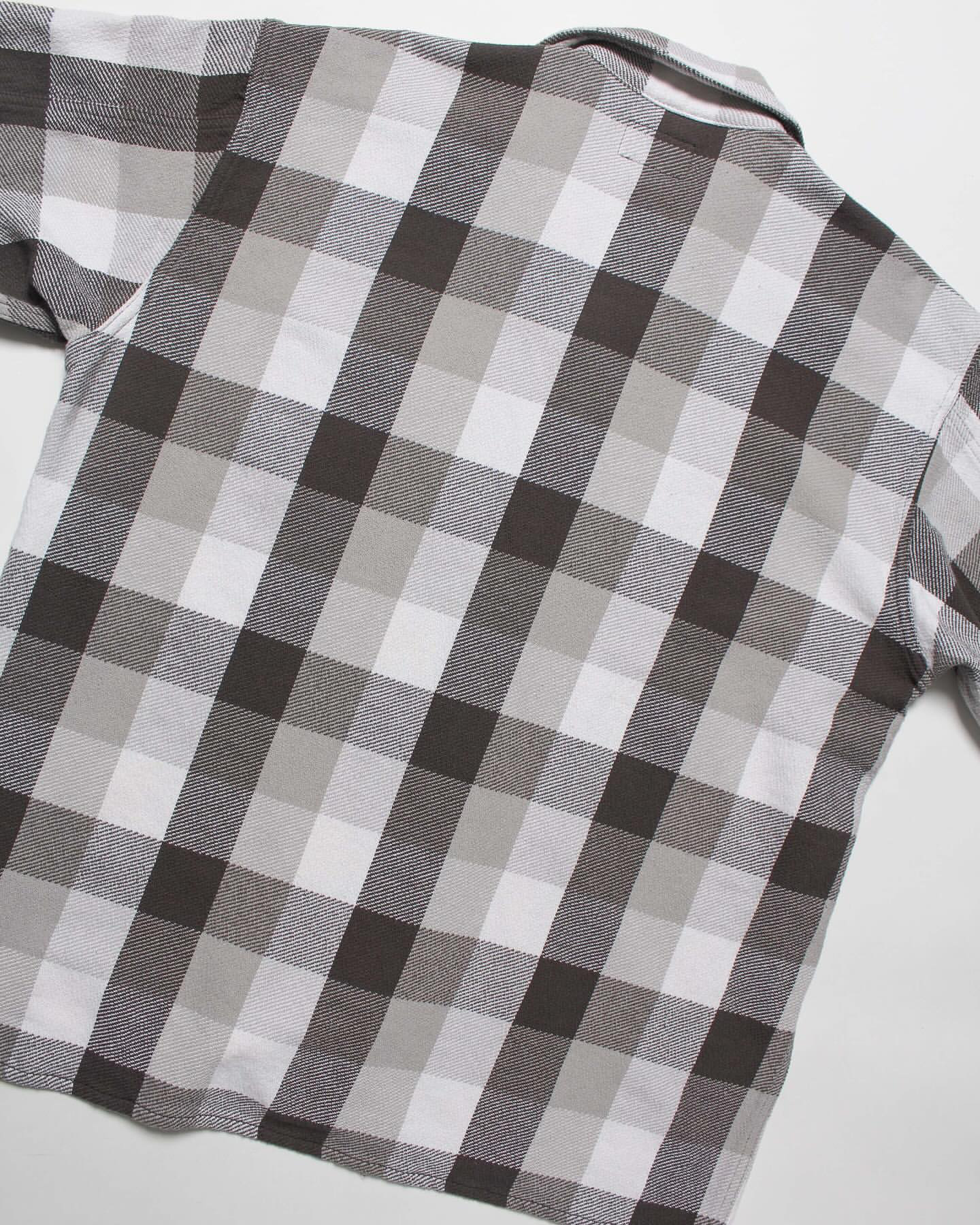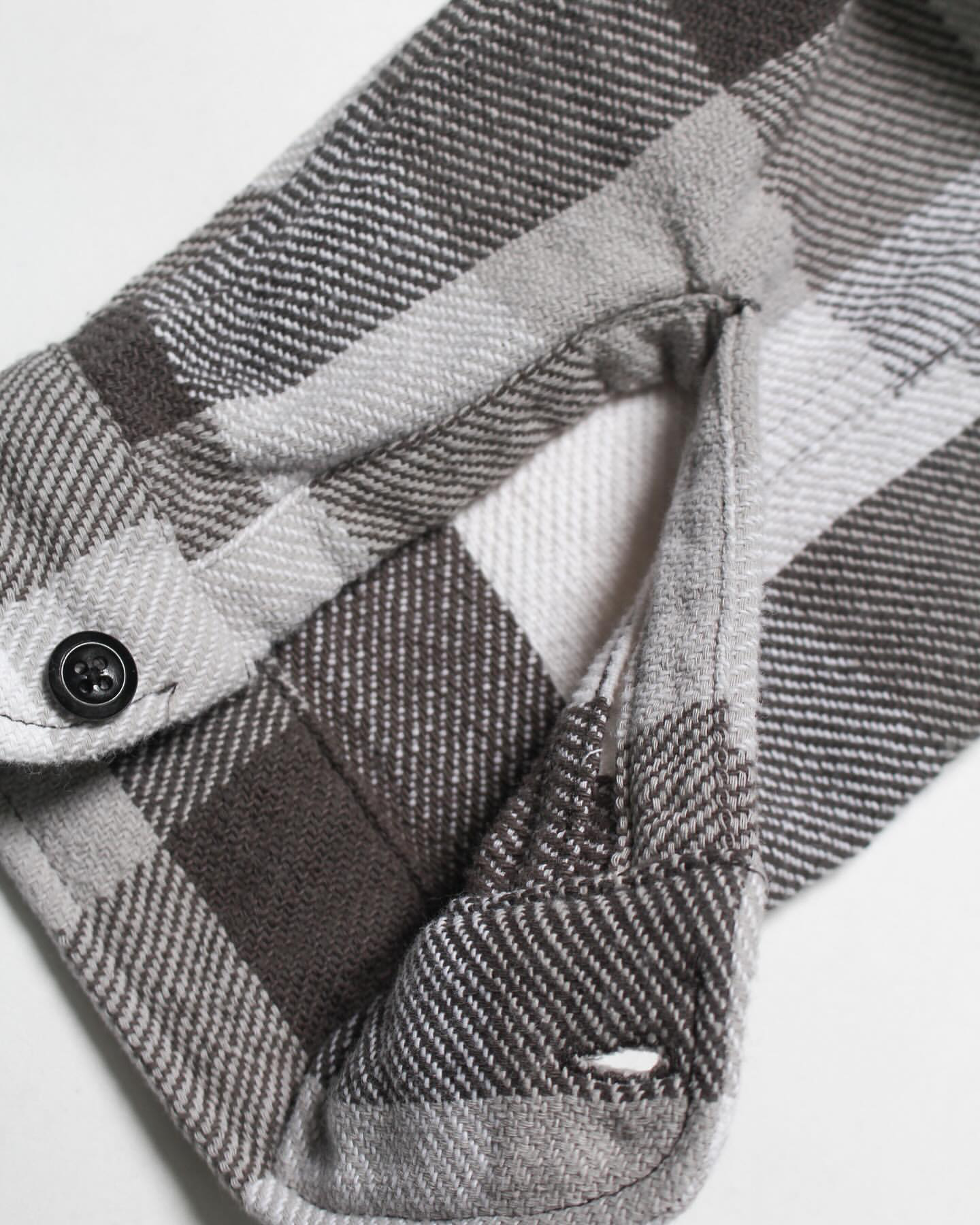 1940〜50年代、限られた有名ワークブランドだけが製作した厚地チェックネルの開襟シャツ。寒冷地の伐採現場や鉄道作業、アウトドアユースなど、厳しい環境での防寒着として重宝された一着は、耐久性と保温性、そしてブランド独自のディティールが誇りを語っていた。本作は、その時代特有の重厚なチェックネルをグレー×ホワイトの配色で再現。肩や袖付けのステッチワーク、ポケット形状などの細部まで当時の意匠を踏襲しつつ、現代的なフィッティングへとアップデート。