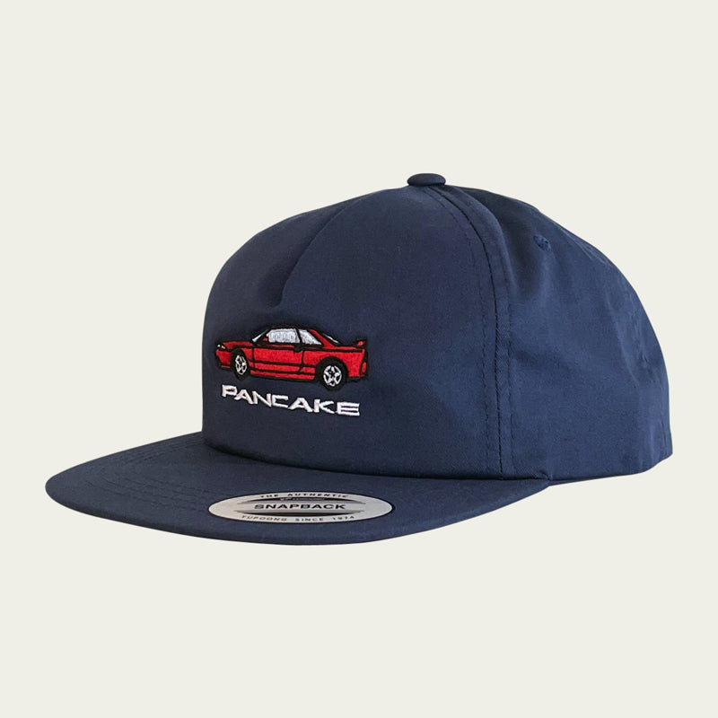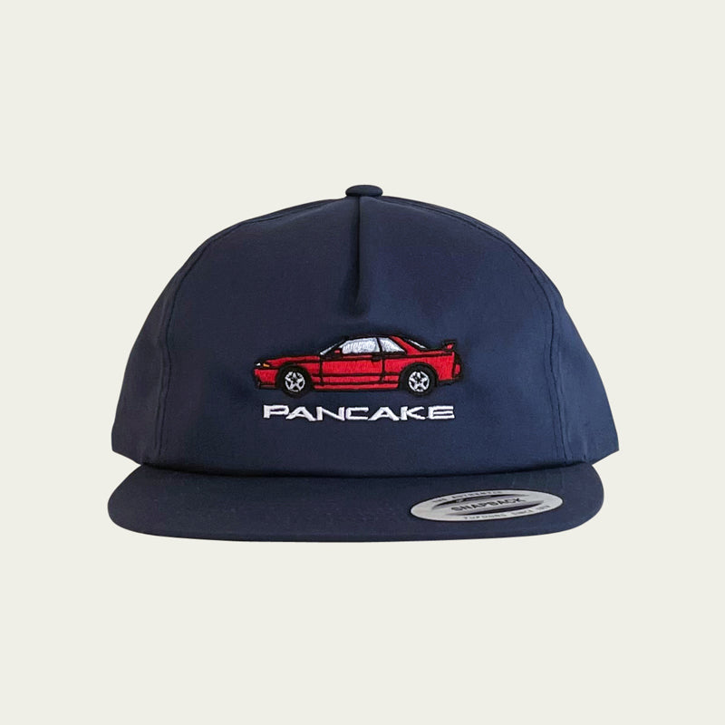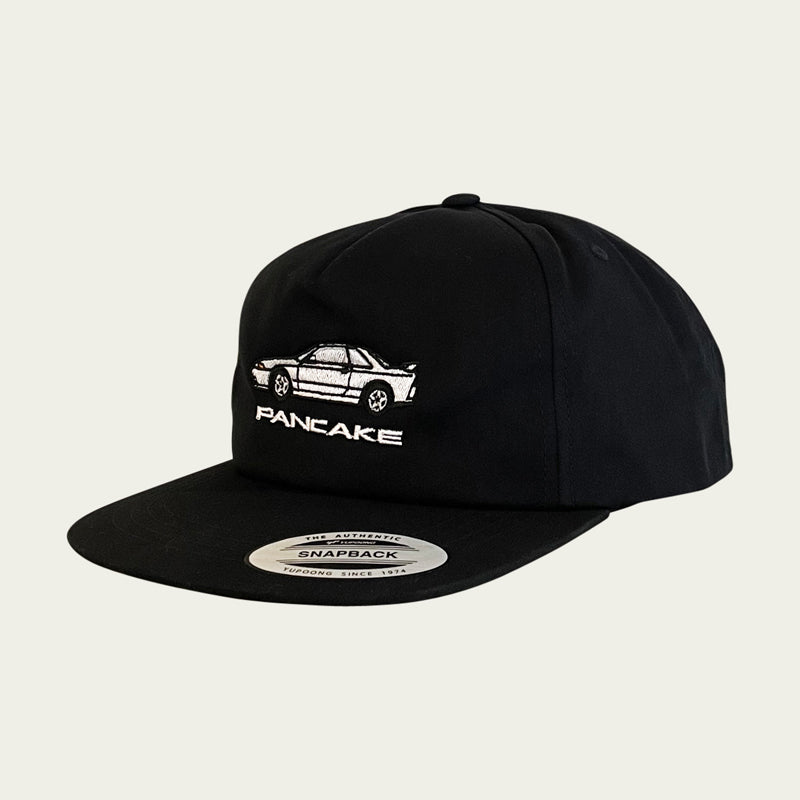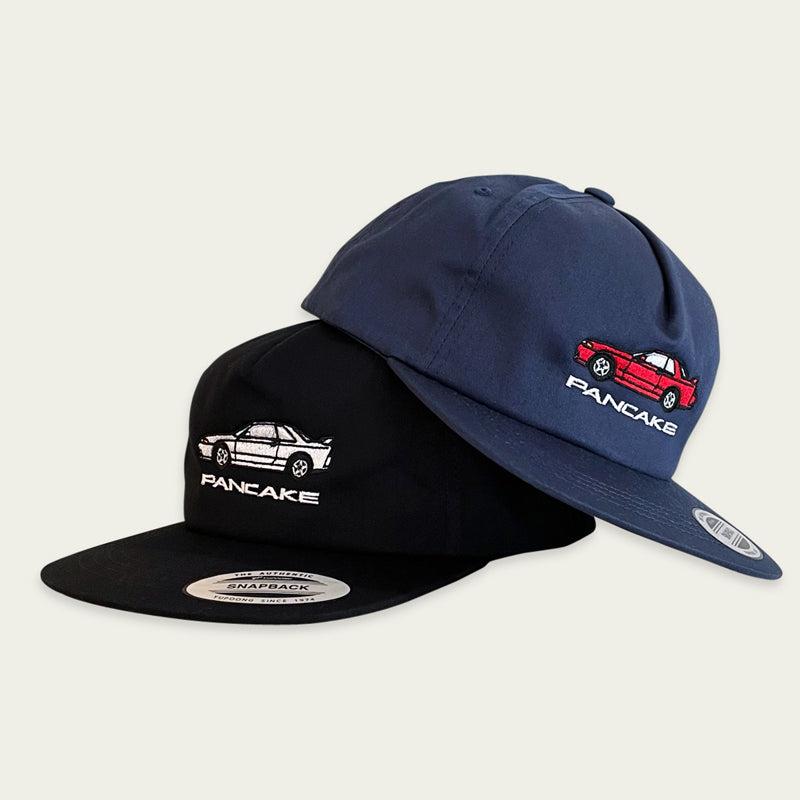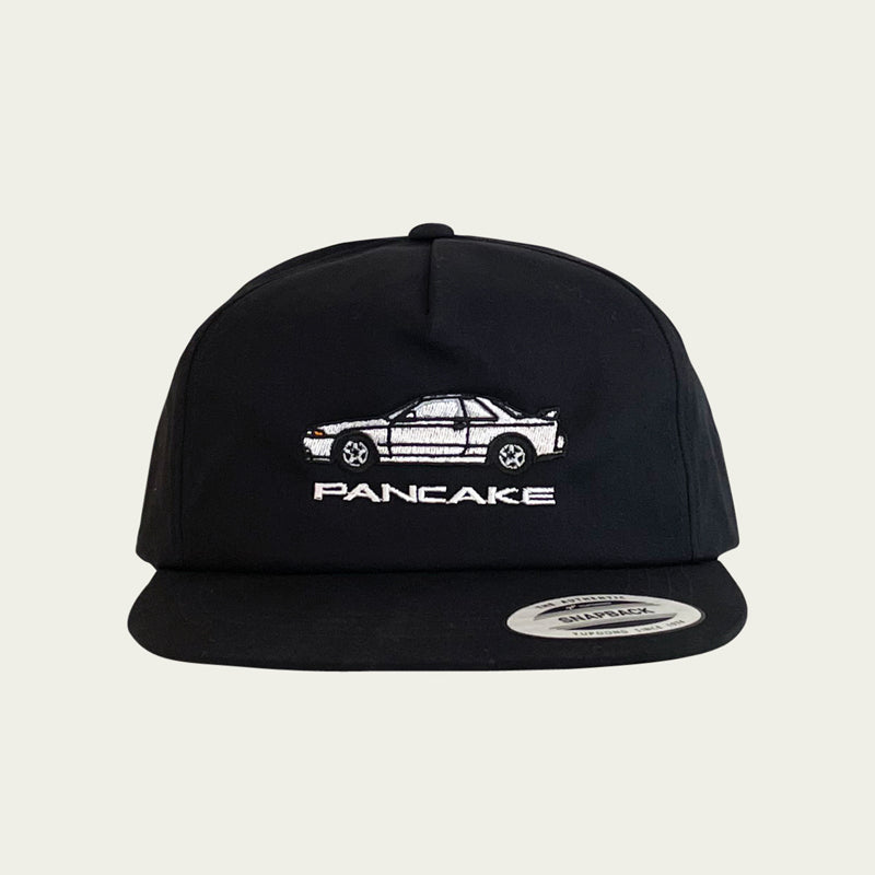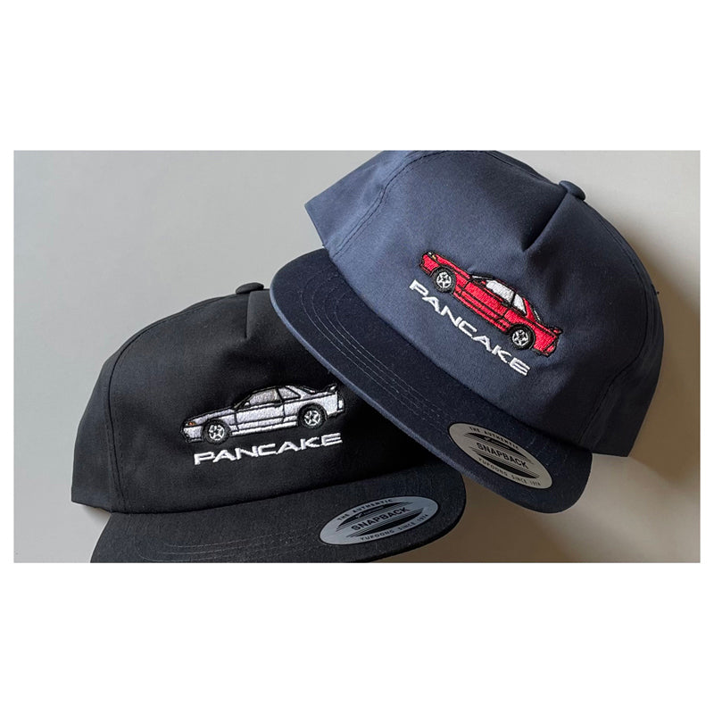 日本のクラッシックカー "R32" GT-R をモチーフにしたアートワークが刺繍で施された〈PANCAKE〉のスナップバックキャップです。フロントに芯が入ってない柔らかいかぶり心地が特徴のアンストラクチャードキャップ。バックにピスネーム。ブラック、ネイビーの2色展開。