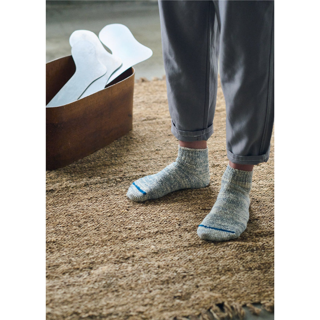 本来は捨てられてしまうオーガニックコットンの短い糸「落ち綿」を紡いだ、ふわっとした手紡ぎのような風合いが特徴の一足。丈はくるぶしを包み込むアンクル丈です。