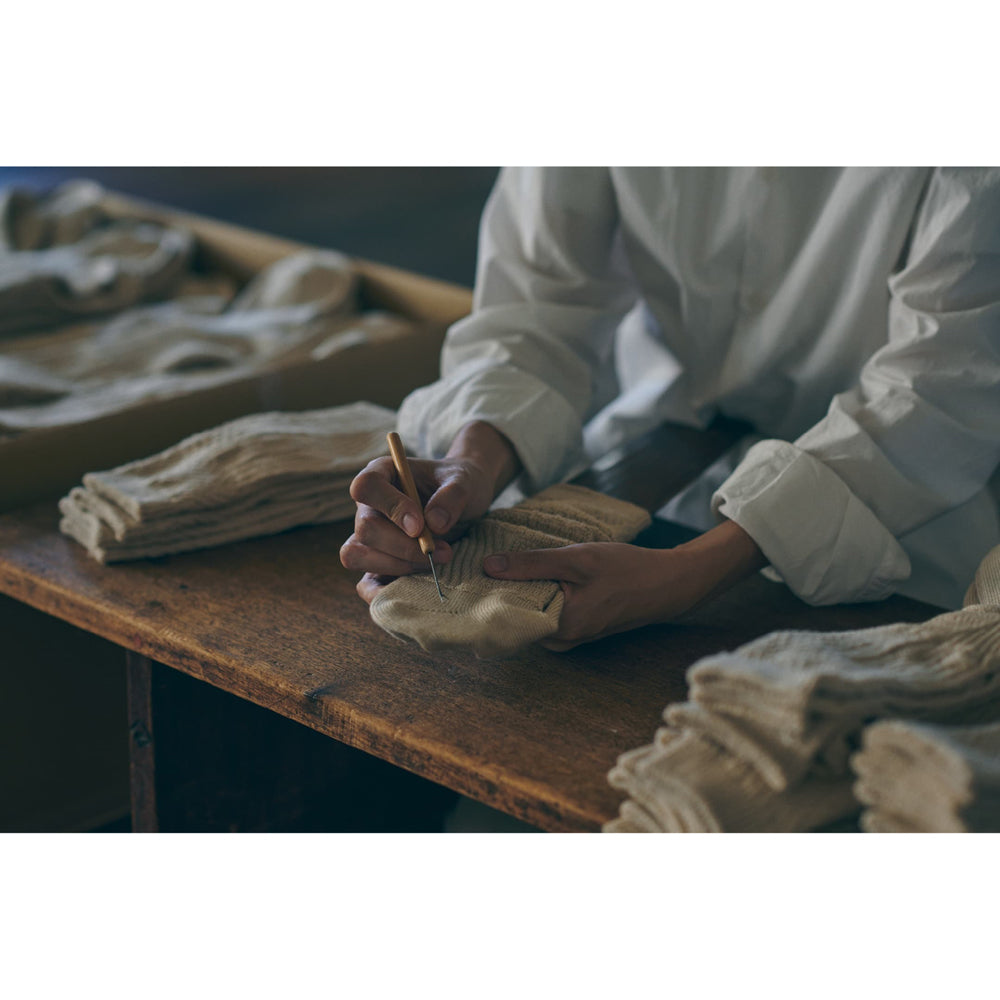 オーガニックコットンの不均一な凸凹感のある風合いは、空気をたくさん含み、厚手ながらも見た目以上の軽やかさで肌触りもしなやか。柔らかく締め付けのない優しさのある履き心地が魅力です。