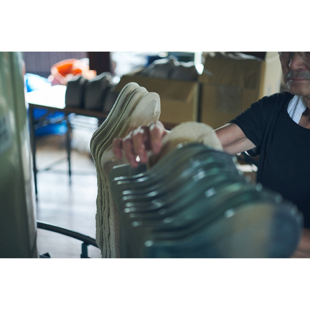 ガラ紡とは、日本で発達した紡績方法で、繊維長が短い和綿を機械的に紡績する方法として明治時代の初期に考案された和紡機です。ガラ紡糸は、そんな特性を活かして、オーガニックコットンの落ち綿を原料に使用しています。不均一な凸凹とした独特のムラ感で空気をたくさん含むため、心地よい履き心地です。