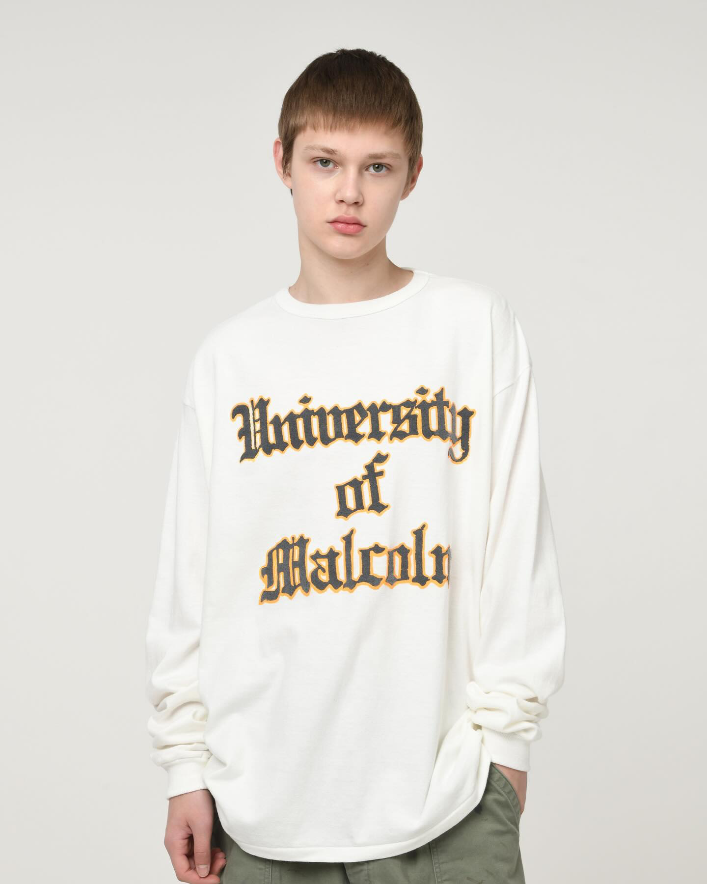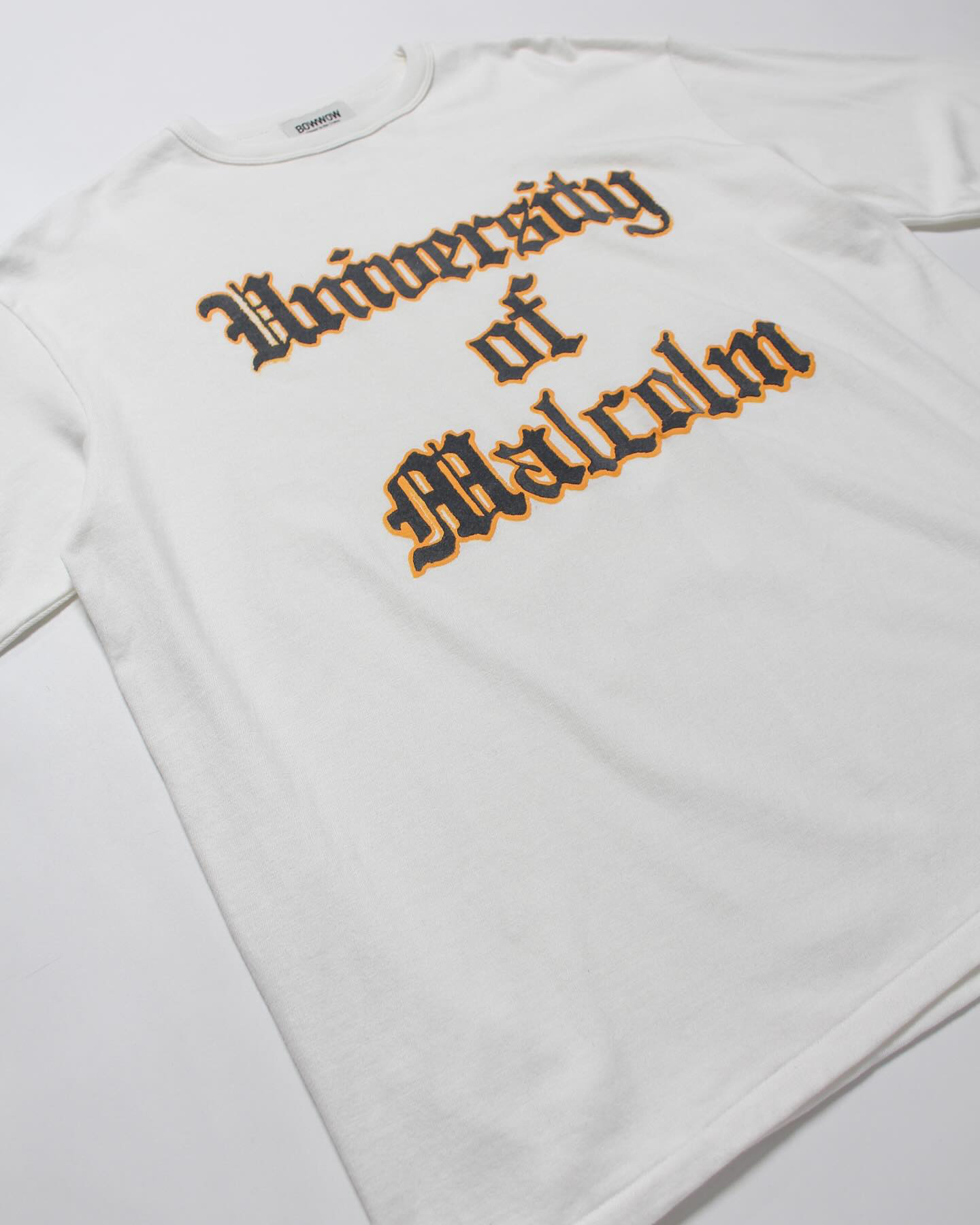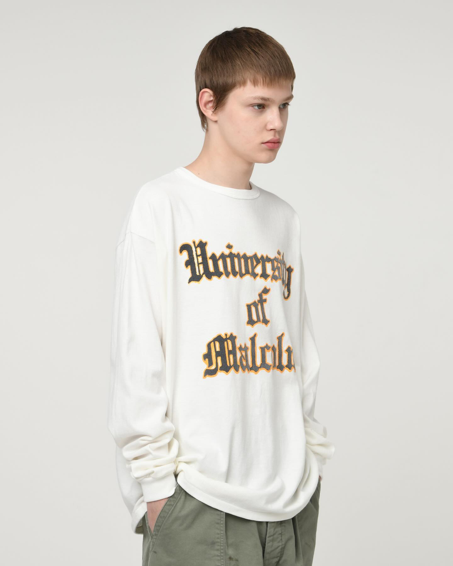 架空のマクラーレン大学を舞台に、60年代の購買部で販売され、生徒が毎日着続けた様を表現。植毛フロッキープリントを採用し、毛足の表現までプリント職人の拘りを凝縮し、新たなプリント表現が完成した。ボディは、ブランドを代表する丸胴天竺であり、コットン88%/レーヨン12%の組成で仕立てたロンティー。糸選びだけでなく裁断・縫製まで作り込み、ビッグサイズまで丸胴仕様を貫徹。着込みと洗いで退色と表情が深まり、ヴィンテージと見分けがつかない域に至るブランドが目指す完成形。