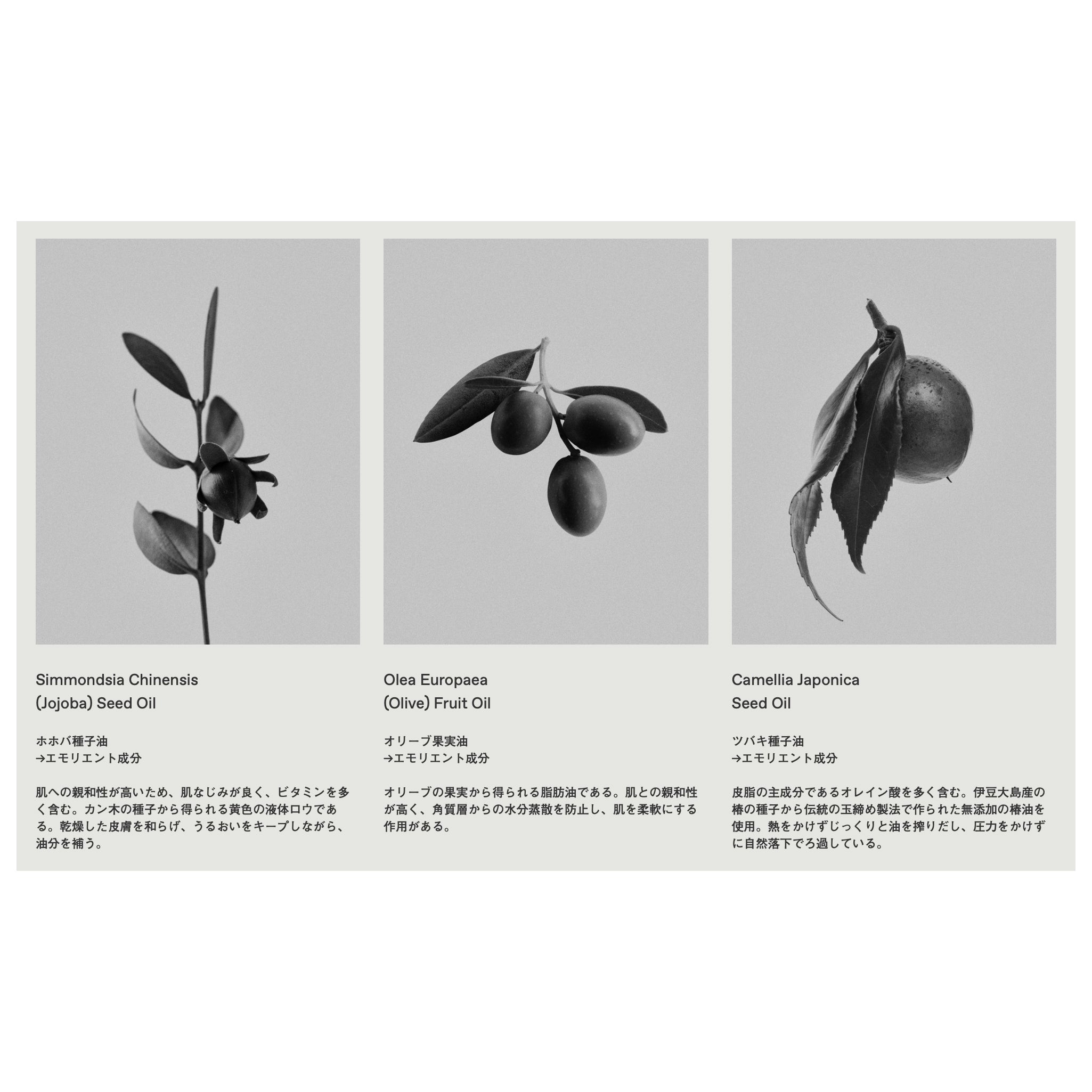 ●高保湿成分配合 ツバキ花エキス、ホホバ種子油、オリーブ果実油、シア脂がうるおいを閉じ込める。