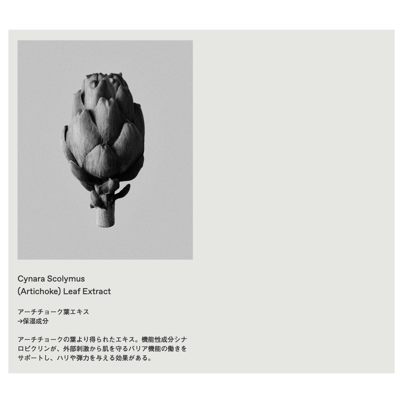 〈全成分〉水、メトキシケイヒ酸エチルヘキシル、ジエチルアミノヒドロキシベンゾイル安息香酸ヘキシル、イソペンチルジオール、イノシトール、(ビニルジメチコン/メチコンシルセスキオキサン)クロスポリマー、グリチルレチン酸ステアリル、(アクリレーツ/アクリル酸アルキル(C10-30))クロスポリマー、フェノキシエタノール、水酸化K、エチルヘキシルグリセリン、ポリアクリレートクロスポリマー-6、キサンタンガム、1,2-ヘキサンジオール、3-O-エチルアスコルビン酸、エチドロン酸、BG、ホホバ種子油、オリーブ果実油、ツバキ種子油、シア脂、シリカ、プロパンジオール、アクリレーツコポリマー、グリチルリチン酸2K、ツバキ花エキス、ツボクサ葉エキス、アーチチョーク葉エキス