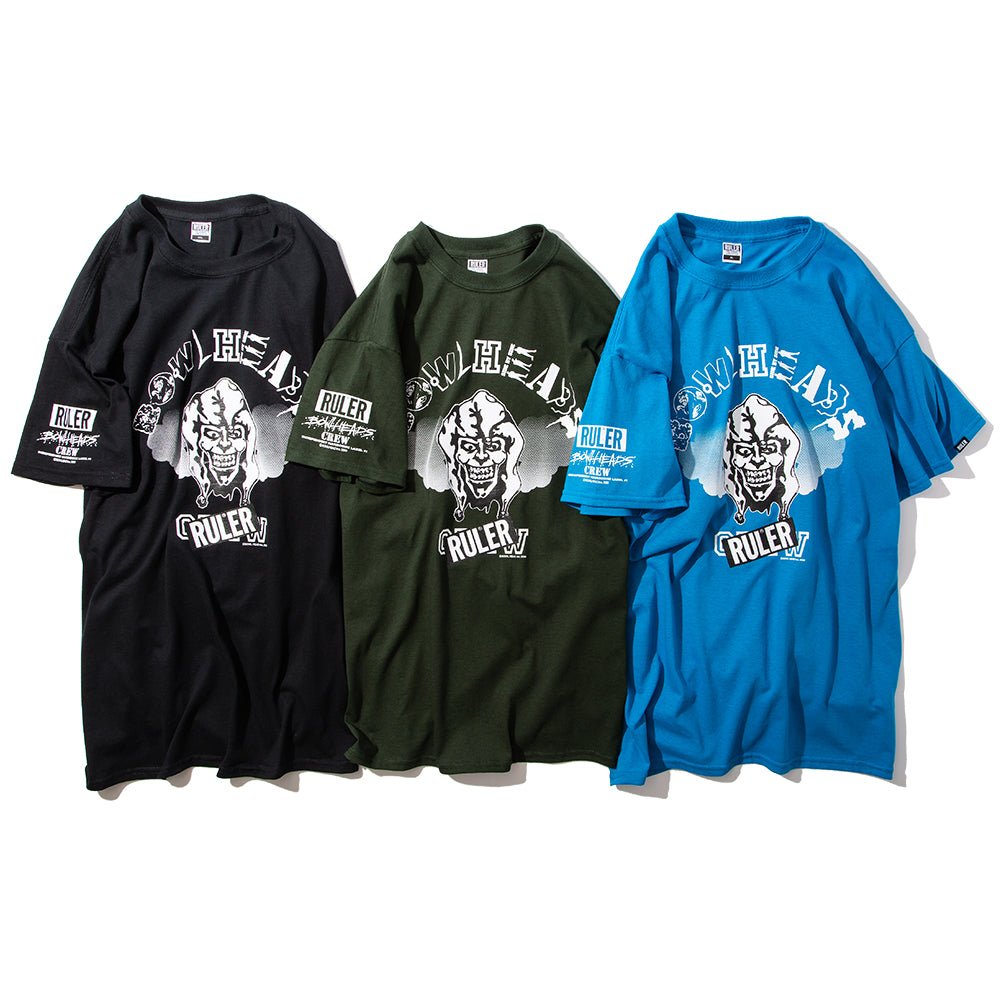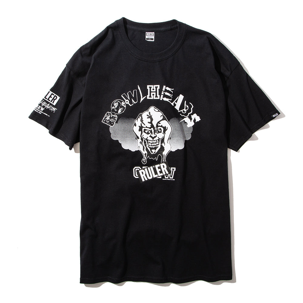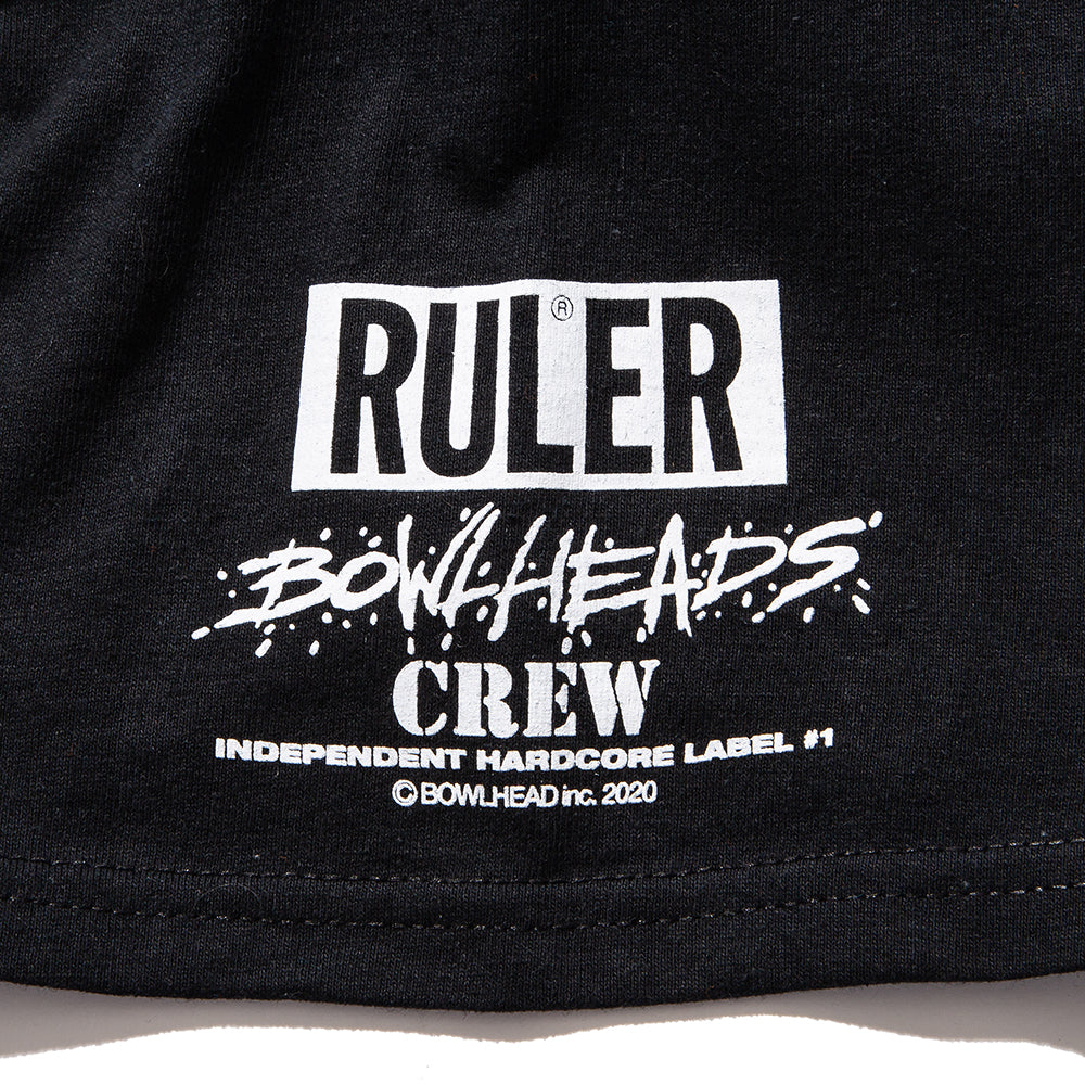 〈RULER®︎〉より、TOKYO NO.1 HARDCOREレーベル〈BOWLHEAD INC.〉とのWネームによるTシャツです。フロント・アームにシルクスクリーンプリントでアートワーク、袖口にピスネームを配置。