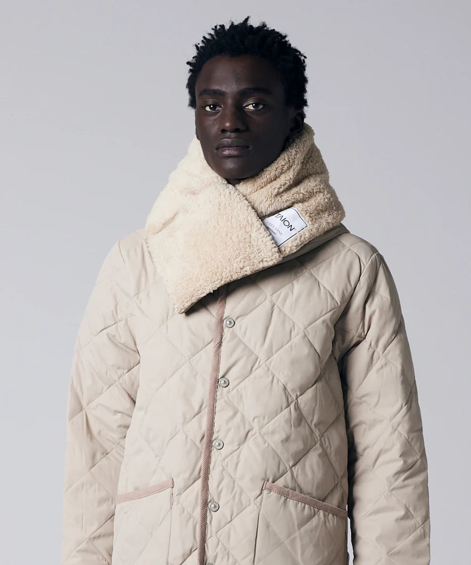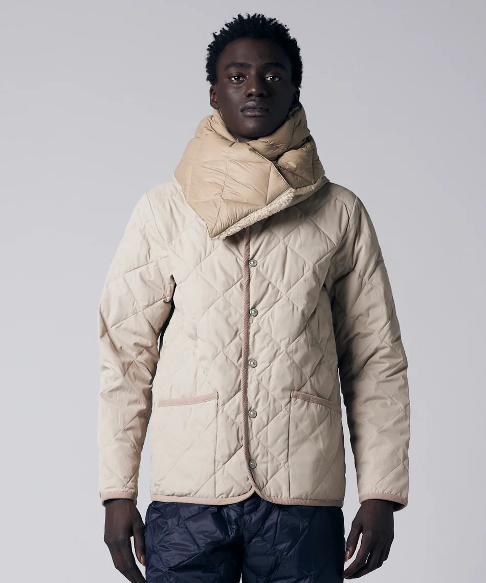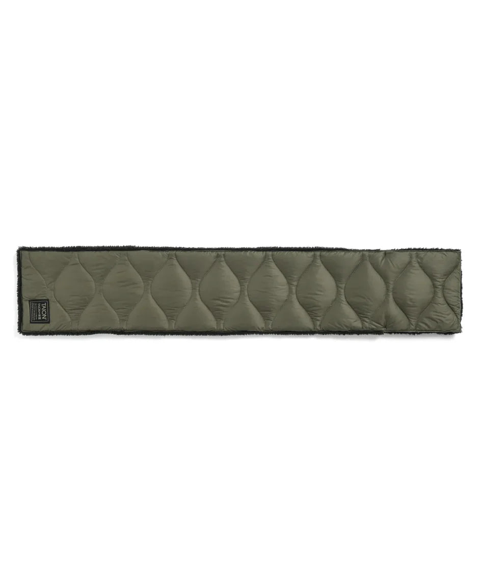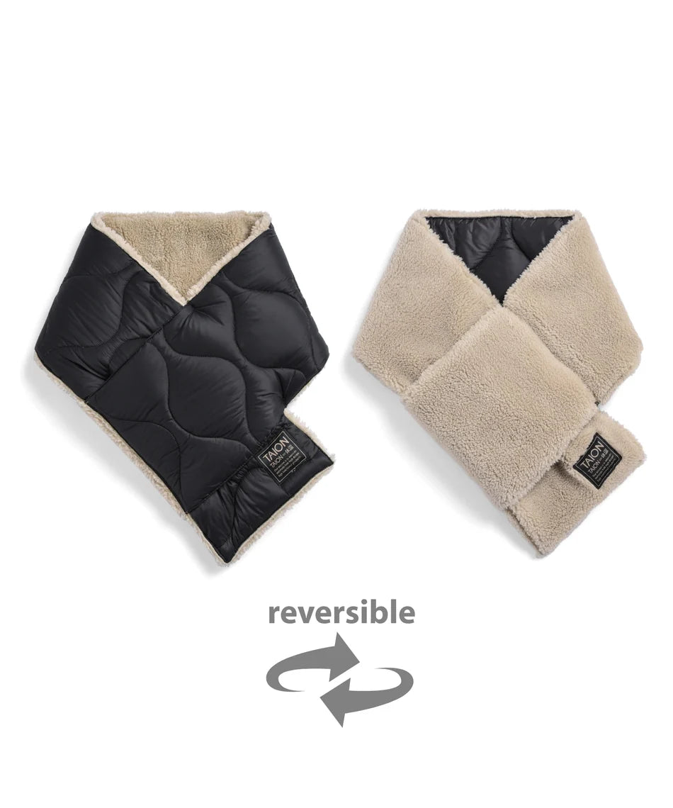 首元を柔らかく包み込む、〈TAION®︎〉ミリタリーラインのリバーシブルダウンマフラーです。保温性の高い800FPの上質ダウンを採用し、ヘチマキルトで仕上げ、裏側にはボア素材を使用しています。